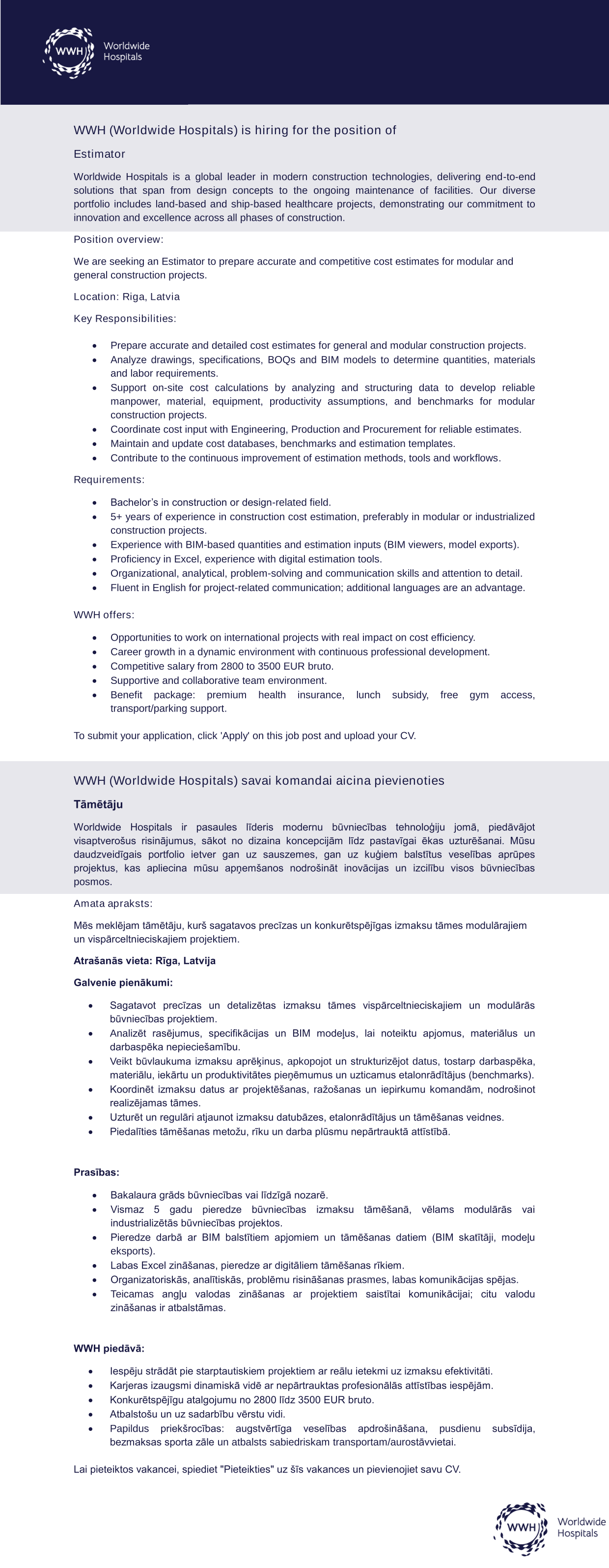 Additional information: Health insurance, lunch subsidy, parking subsidy, public transport reimbursement, free gym