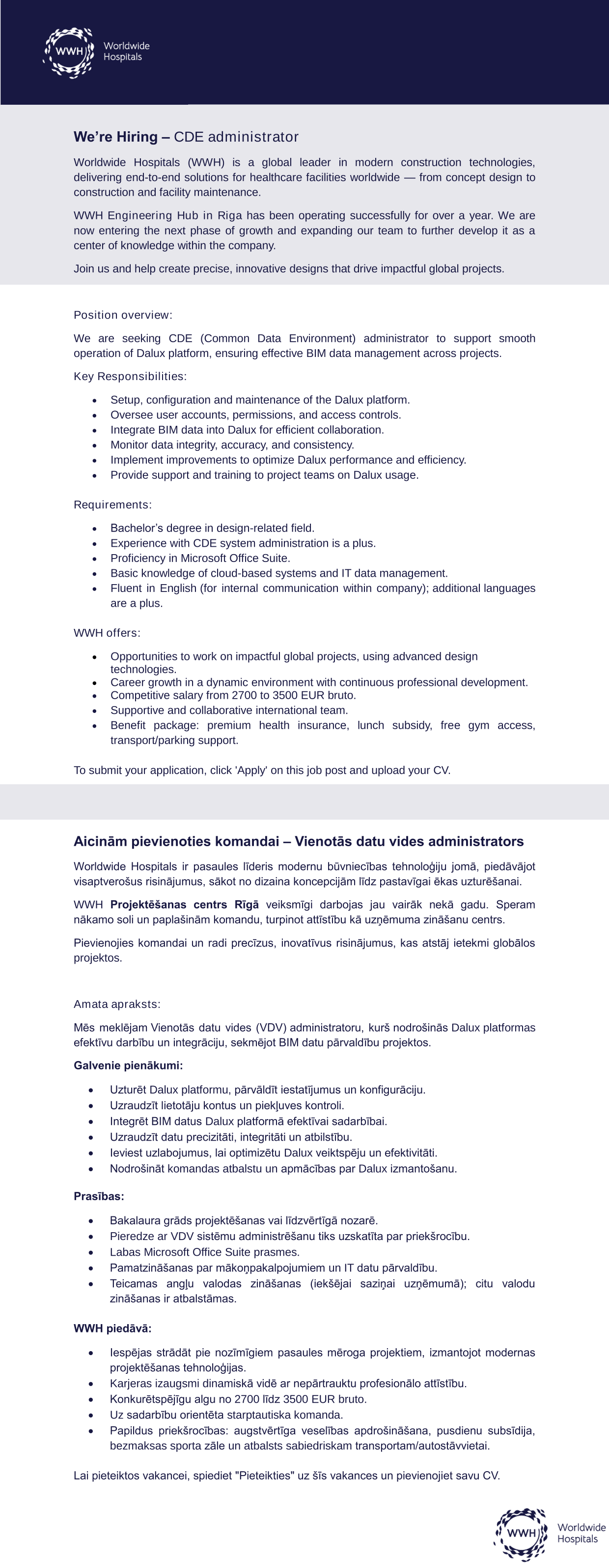 Additional information: Health insurance, lunch subsidy, parking subsidy, public transport reimbursement, free gym access