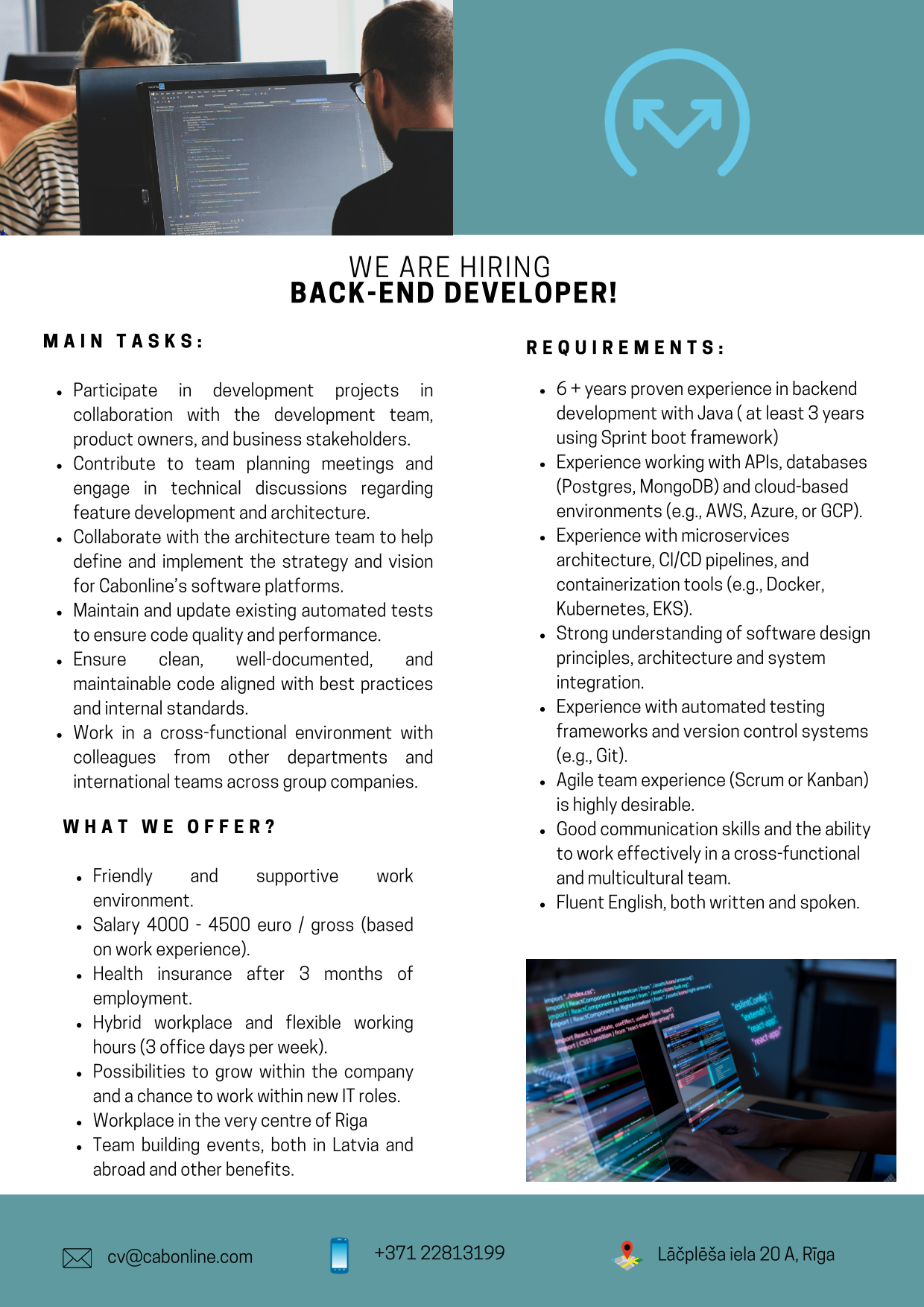 - Sadarboties ar arhitektūras komandu, lai palīdzētu definēt un īstenot Cabonline programmatūras platformu stratēģiju un vīziju.
