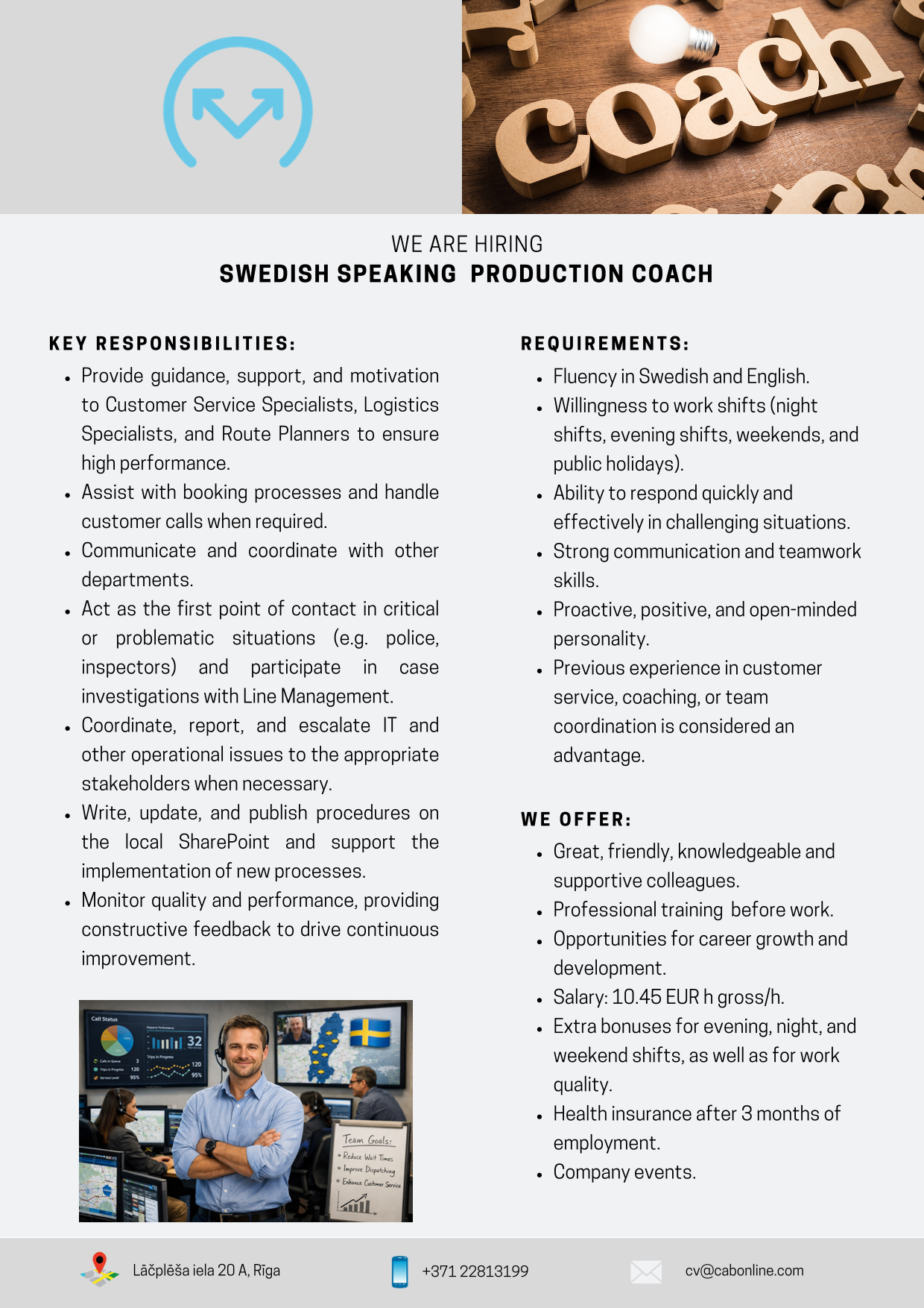 The company Cabonline Latvia has been operating in Latvia since 2005, providing high-quality call center and logistics services to clients in Sweden. It is part of the Cabonline Group, Swedens largest taxi service company, which offers taxi and courier services in Sweden, Finland, and Norway.