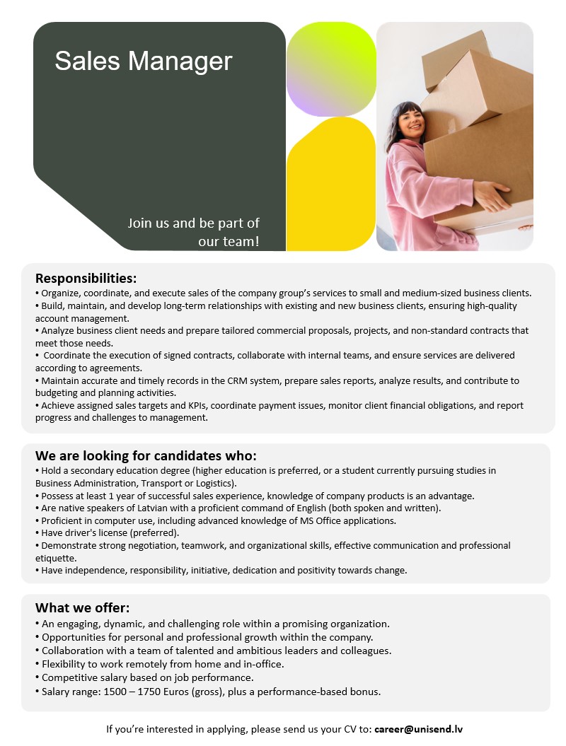 To ensure the integrity of our team at Unisend, we may request additional information from applicants to guarantee reliability and a strong reputation. For more information about the handling of your personal data, please visit: https://unisend.lv/wp-content/uploads/2024/04/Privacy-notice-for-candidates-LV.pdf