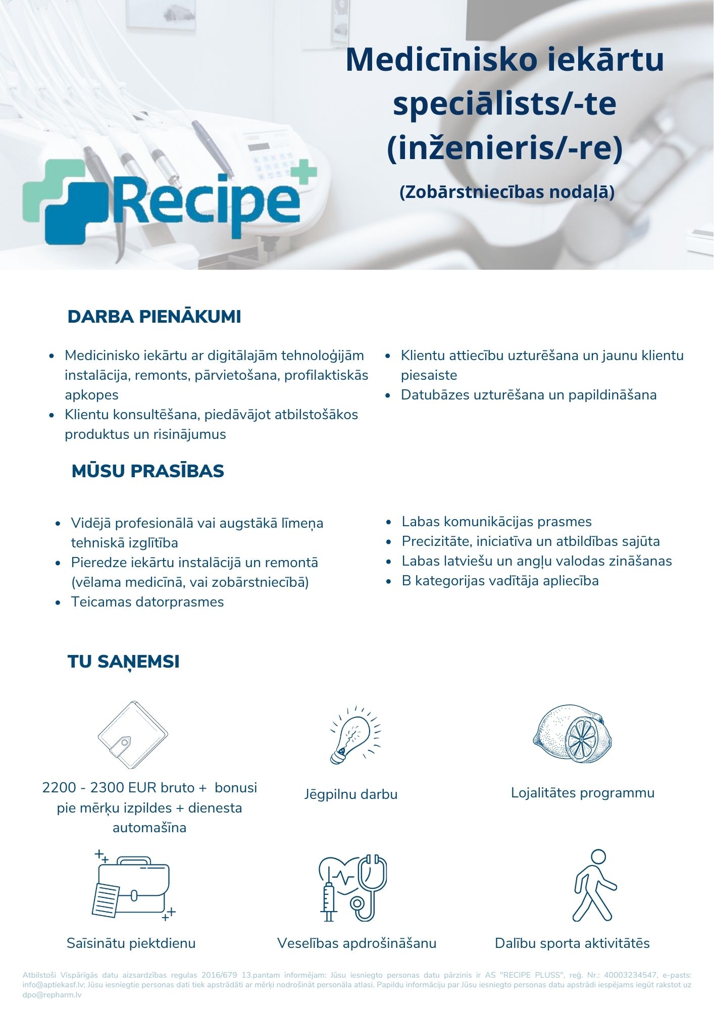 AS “Recipe Plus” ir viens no lielākajiem vairumtirgotājiem Latvijā, kas izplata farmaceitiskos un veselības aprūpes produktus aptiekām, veselības aprūpes iestādēm, veterinārajām klīnikām un zobārstniecības kabinetiem. Kā viens no pirmajiem farmaceitisko produktu vairumtirgotājiem Latvijā AS Recipe Plus ir dibināta 1995. gadā. Nepārtrauktas izaugsmes un attīstības rezultātā uzņēmumam ir izdevies kļūt par vadošo zāļu vairumtirgotāju Latvijā.