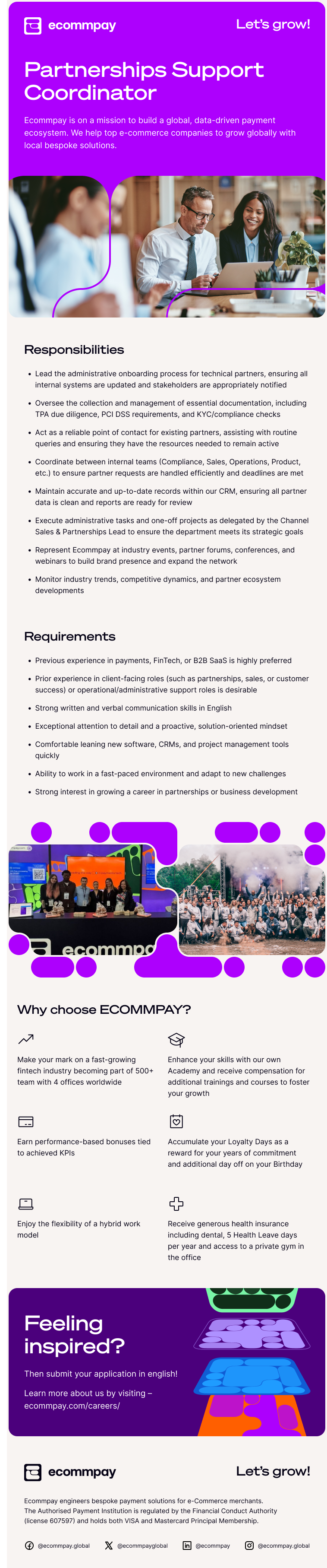 Ecommpay is a payment service provider and a direct bank card acquirer. As thrilling experts, not only do we work hard to create tailor-made, data-driven technologies for our clients, we also grow their businesses and ours, leading courageously and sharing our knowledge within the fast-growing fintech community. Our payment gateway facilitates an omnichannel payment process, combining acquiring capabilities, 100+ payment methods, mass payouts, and technological innovation within a single, seamless integration. Our fintech ecosystem is run by over 500 driven professionals who dream big and strive for excellence across 4 global offices. The thing that matters most is our people with diverse and courageous minds and extraordinary results that we achieve together. We have built a dynamic and fun environment where you can feel surrounded by energetic people and inspiring leaders involved in challenging international projects. We are always looking for bright talents. If you can evolve with speed, take rapid action and optimistically conquer challenges at every corner, then join us and help to steer the growth of our payment solutions and become a driving force at Ecommpay.