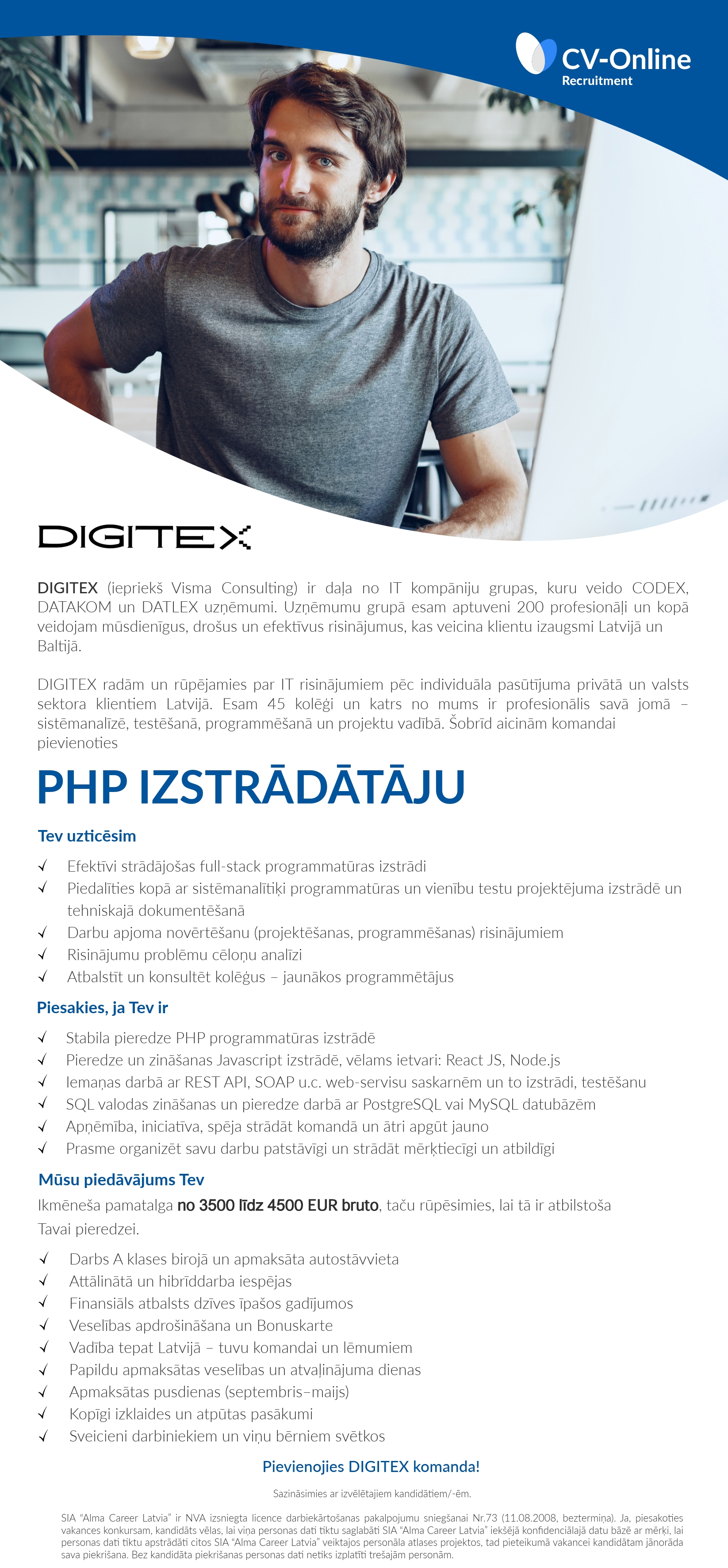 DIGITEX (iepriekš Visma Consulting) ir daļa no IT kompāniju grupas, kuru veido CODEX, DATAKOM un DATLEX uzņēmumi. Uzņēmumu grupā esam aptuveni 200 profesionāļi un kopā veidojam mūsdienīgus, drošus un efektīvus risinājumus, kas veicina klientu izaugsmi Latvijā un