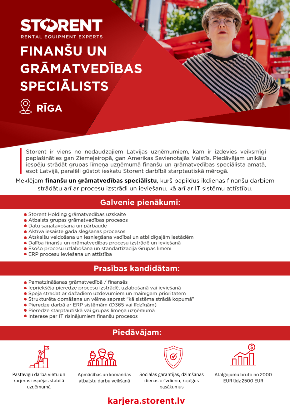 STORENT grupa ir tehnikas nomas uzņēmums, kas ar ievērojamiem panākumiem darbojas Baltijas reģionā, Zviedrijā un Somijā. Zinām, ka stipru komandu veido spēcīgas personības un stabilas uzņēmuma vērtības. Ja darbs lielā, starptautiskā uzņēmumā, kas balstās profesionalitātē, kvalitātē un izcilā klientu servisā, liek Tavām acīm mirdzēt, iespējams, Tava vieta ir mūsu vidū.
