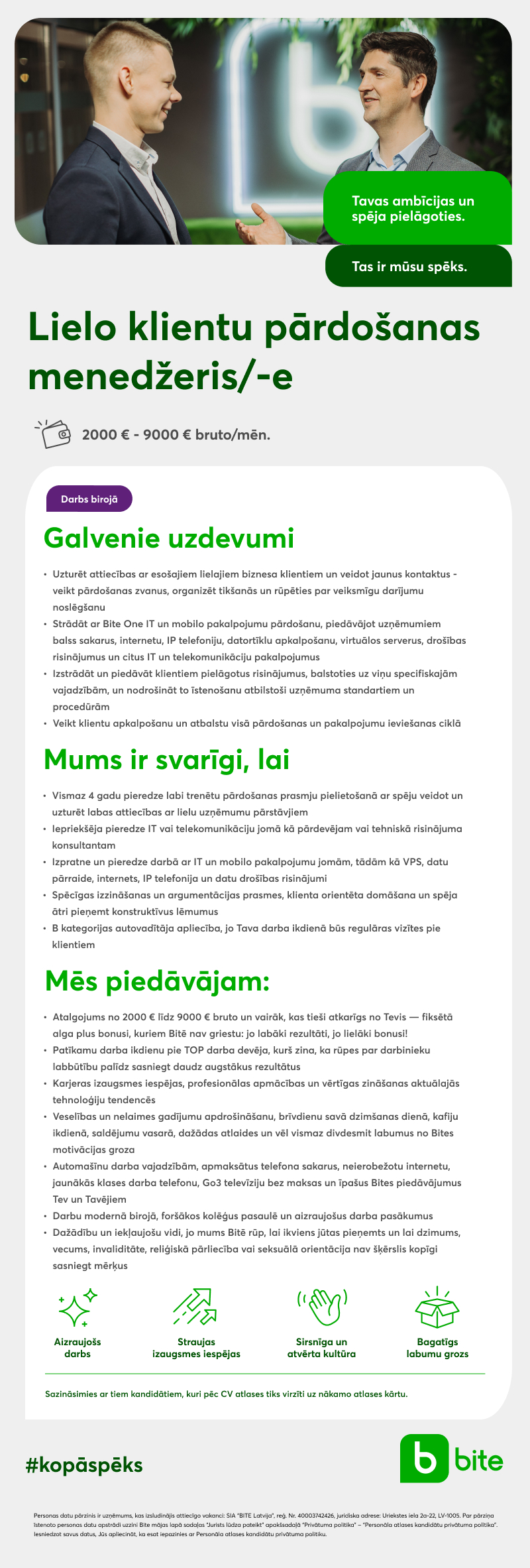 Bite visstraujāk augošais informācijas un komunikācijas tehnoloģiju uzņēmums Latvijā, kas jau vairāk nekā 18 gadus nodrošina mūsdienīgus, inovatīvus, klientu vajadzībām atbilstošus mobilo un fiksēto sakaru pakalpojumus, nākamās paaudzes televīziju Go3 un integrētus IKT risinājumus biznesa klientiem. Šobrīd nodarbinām vairāk nekā 950 dažādu jomu speciālistu visā Latvijā. Bites biroji atrodas Rīgā, Rēzeknē un Bites saloni atrodas visā Latvijā.