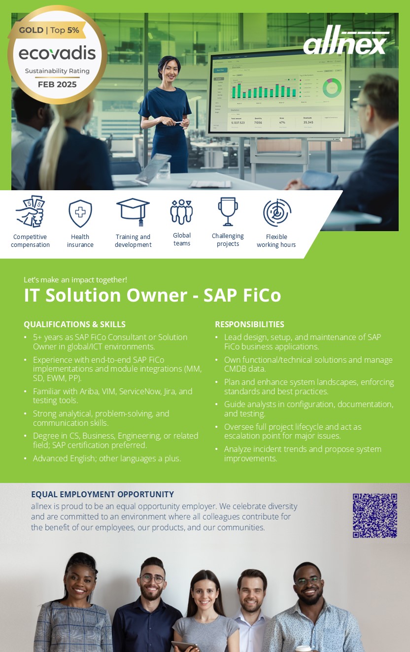 As a Solution Owner within the Digital Transformation and Innovation team of allnex Global IT, you will lead multiple applications Business Services portfolio addressing Finance, HR, Procurement and Legal functions. Operating globally (our presence spans between Europe, Asia, and the Americas),you will act as the knowledge lead for several applications, safeguarding templates and driving functional improvements. You will be engaged throughout the full solution lifecycle from design, realization, and testing to cut-over, go-live, hypercare, and run with a consistent role in the design phase. Your work will involve managing functional and technical requirements, coordinating analysts, supporting escalations, and ensuring solutions remain aligned with allnex standards. Based in Riga, you will collaborate closely with IT Delivery Partners, Project Managers, and global business stakeholders, reporting within a matrix to the IT Business Partner.