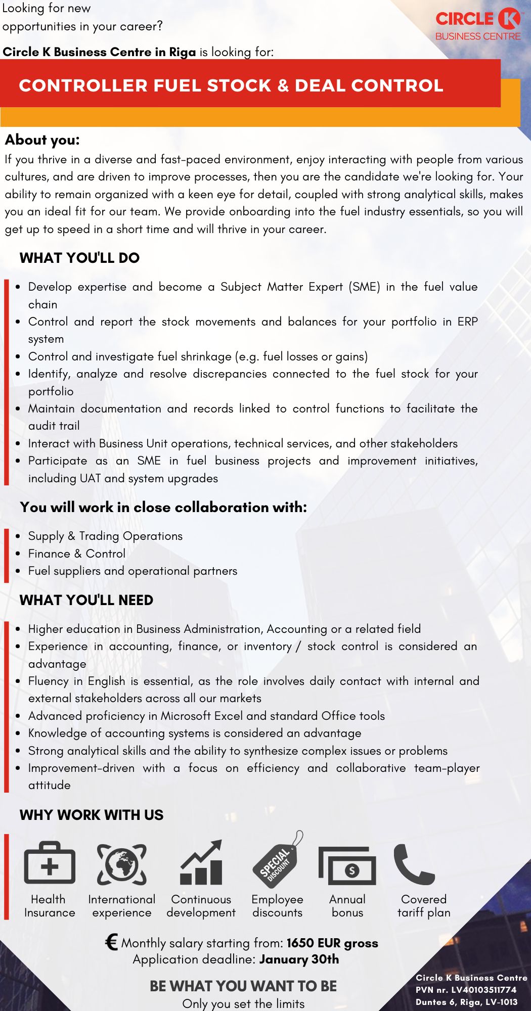 Circle K Business Centre in Riga is one of the biggest support offices in our global Circle K family. Were more than 750 professionals who are providing services in areas of Finance, Logistics, IT, Customer Service & HR. Join our international team!