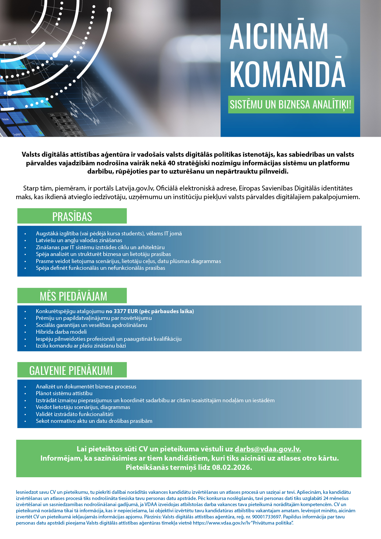 Valsts digitālās attīstības aģentūra ir vadošais valsts digitālās politikas īstenotājs, kas sabiedrības un valsts pārvaldes vajadzībām nodrošina vairāk nekā 40 stratēģiski nozīmīgu informācijas sistēmu un platformu darbību, rūpējoties par to uzturēšanu un nepārtrauktu pilnveidi.