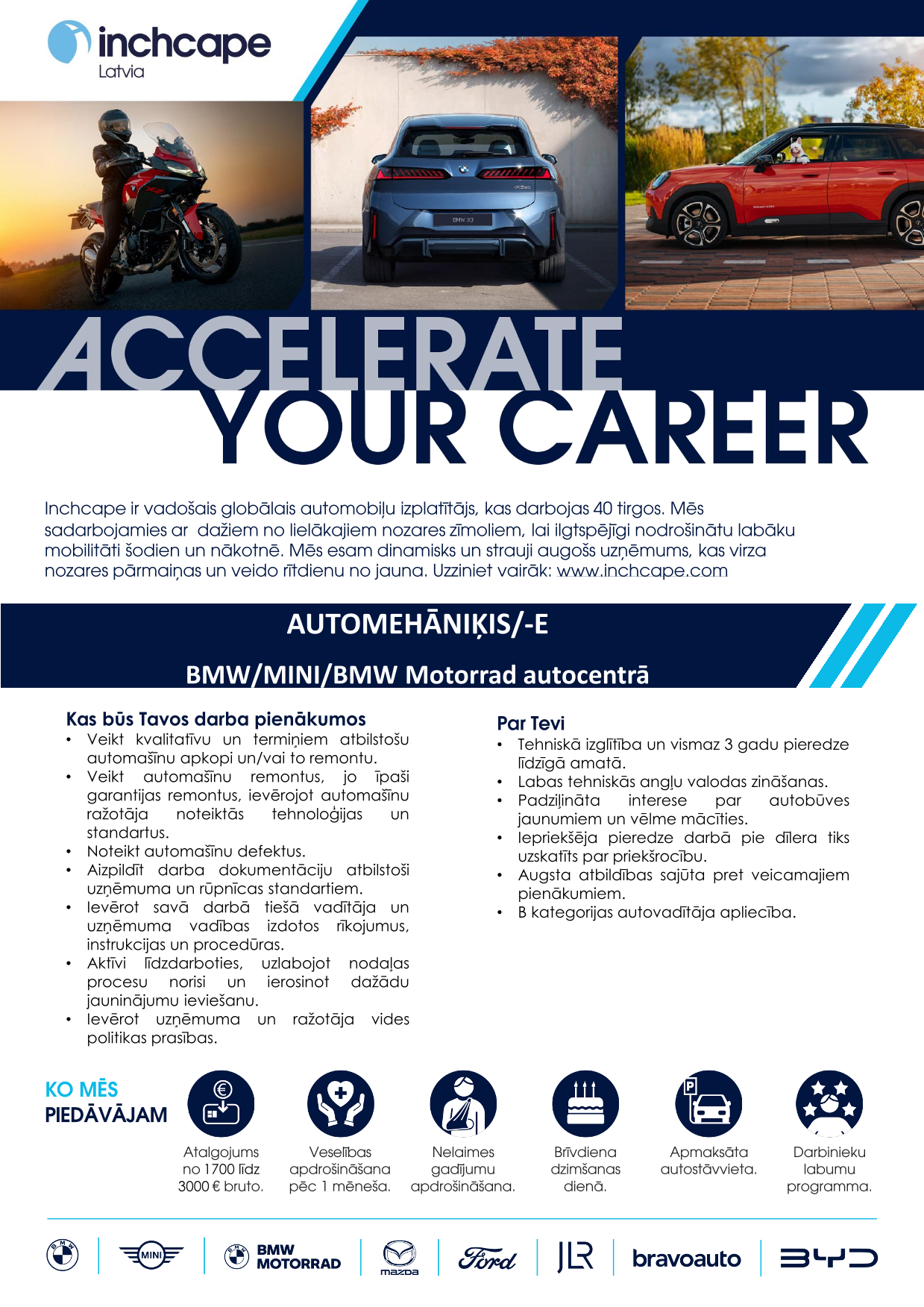 Inchcape ir viens no vadošajiem automobiļu izplatītājiem pasaulē, kas darbojas vairāk kā 40 tirgos. Mēs sadarbojamies ar lielākajiem automašīnu ražotājiem pasaulē, lai nodrošinātu cilvēkiem labāku mobilitāti šodien un nākotnē.Mūsu starptautiskā un daudzpusīgā komanda, kurā ir vairāk kā 20 000 talantīgu darbinieku, veido iekļaujošu un uz sadarbību vērstu uzņēmuma kultūru, sniedzot izcilu pieredzi mūsu klientiem un partneriem. Mēs esam dinamisks un strauji augošs uzņēmums, kura mērķis ir veidot veiksmīgu un ilgtspējīgu nozares nākotni.Šeit jūs varēsiet pilnveidot savu potenciālu, izmantojot sniegtās karjeras iespējas un gūstot mācīšanās pieredzi. Jums būs iespēja strādāt ar modernākajām tehnoloģijām, visjaunākajām inovācijām un progresīvi domājošiem kolēģiem. Ja esat mērķtiecīgs, uz panākumiem vērsts un spējat parādīt labāko sevī un citos, tad pievienojieties mums, lai radītu jaunu nākotni.Inchcape Lativjā ir oficiālais pārstāvis tādiem automašīnu zīmoliem kā Ford, Mazda, Jaguar, Land Rover, BMW, MINI, kā arī motociklu zīmolam BMW Motorrad.Inchcape mērķis ir NODROŠINĀT MOBILITĀTI PASAULES KOPIENĀM ŠODIENAI, RĪTDIENAI UN LABĀKAI DZĪVEI!