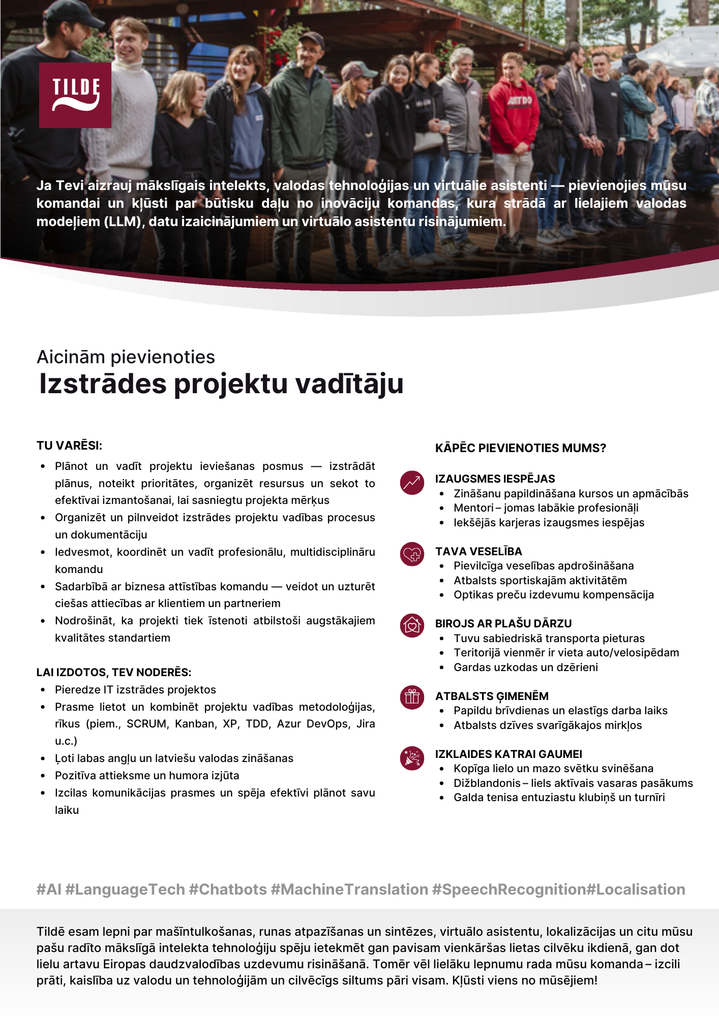 PAR TILDIMēs Tildē esam lepni par mašīntulkošanas, runas atpazīšanas un sintēzes, virtuālo asistentu un citu mūsu pašu radīto mākslīgā intelekta tehnoloģiju spēju ietekmēt gan pavisam vienkāršas lietas cilvēku ikdienā, gan dot lielu artavu Eiropas daudzvalodības uzdevumu risināšanā. Tomēr vēl lielāku lepnumu rada mūsu Baltijas komanda izcili prāti, kaislība uz valodu un tehnoloģijām un cilvēcīgs siltums pāri visam. Kļūsti viens no mūsējiem!