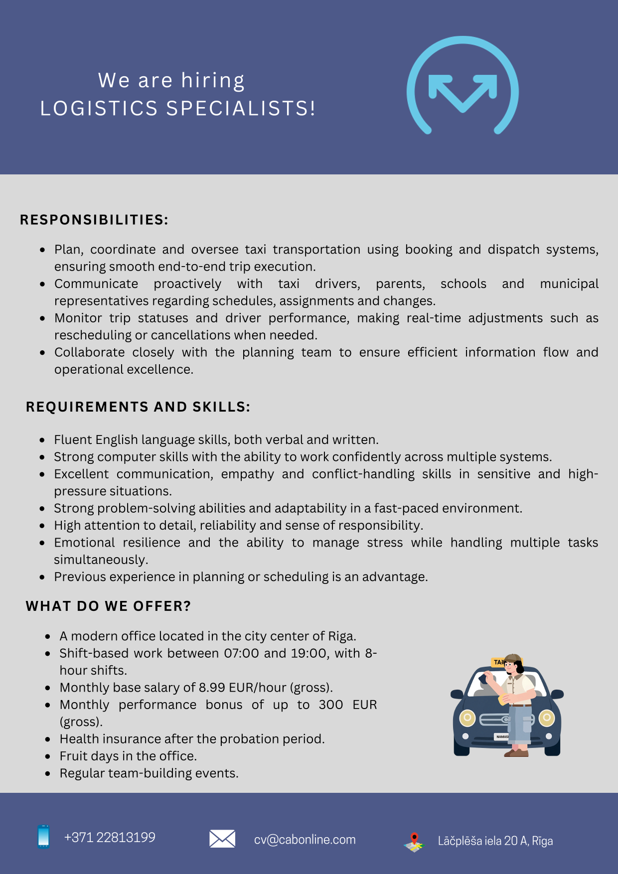 - Proaktīvi sazināties ar taksometru vadītājiem, vecākiem, skolām un pašvaldību pārstāvjiem par grafikiem, uzdevumiem un izmaiņām.