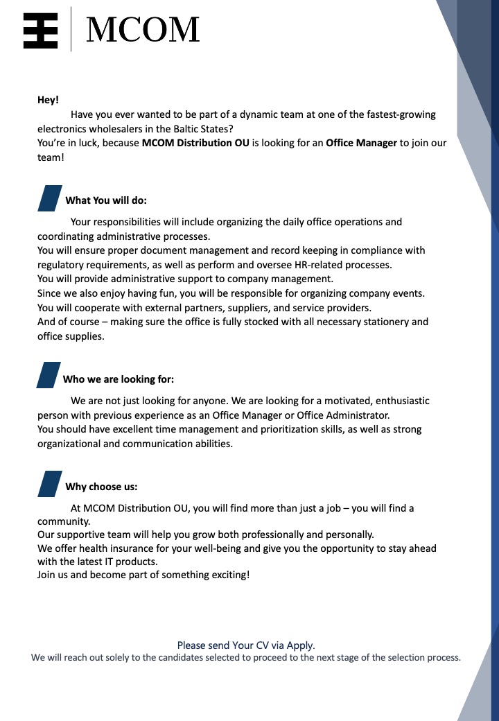 Vai esi kādreiz vēlējies būt daļa no dinamiskas komandas vienā no straujāk augošajiem elektronikas vairumtirgotājiem Baltijas valstīs? Tev ir paveicies, jo MCOM Distribution OU meklē Biroja vadītāju, kas pievienotos mūsu komandai.