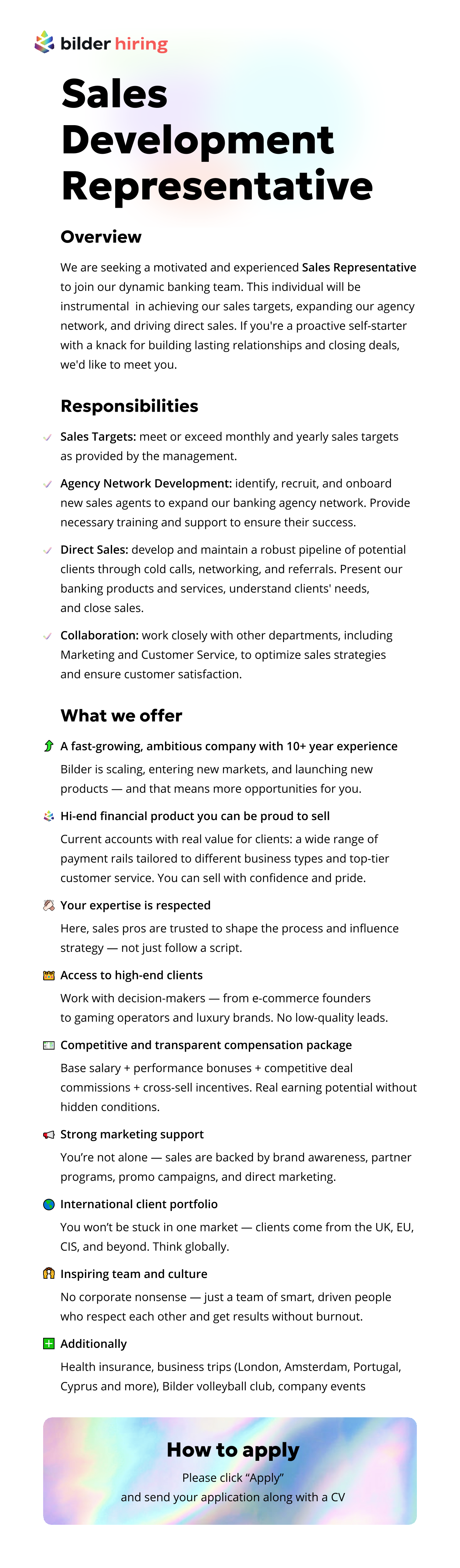 Bilderlings - Fintech platforma, kas piedāvā dažādus finanšu un nefinanšu produktus ar uzsvaru uz ērtību, ātrumu, drošību un cenu. Esam viens no Lielbritānijas Fintech tirgus līderiem, kas piedāvā ātros SEPA maksājumus un starptautiskos SWIFT maksājumus. Pievienojies mūsu profesionālajai komandai un veido karjeru stabilā, strauji augošā uzņēmumā.