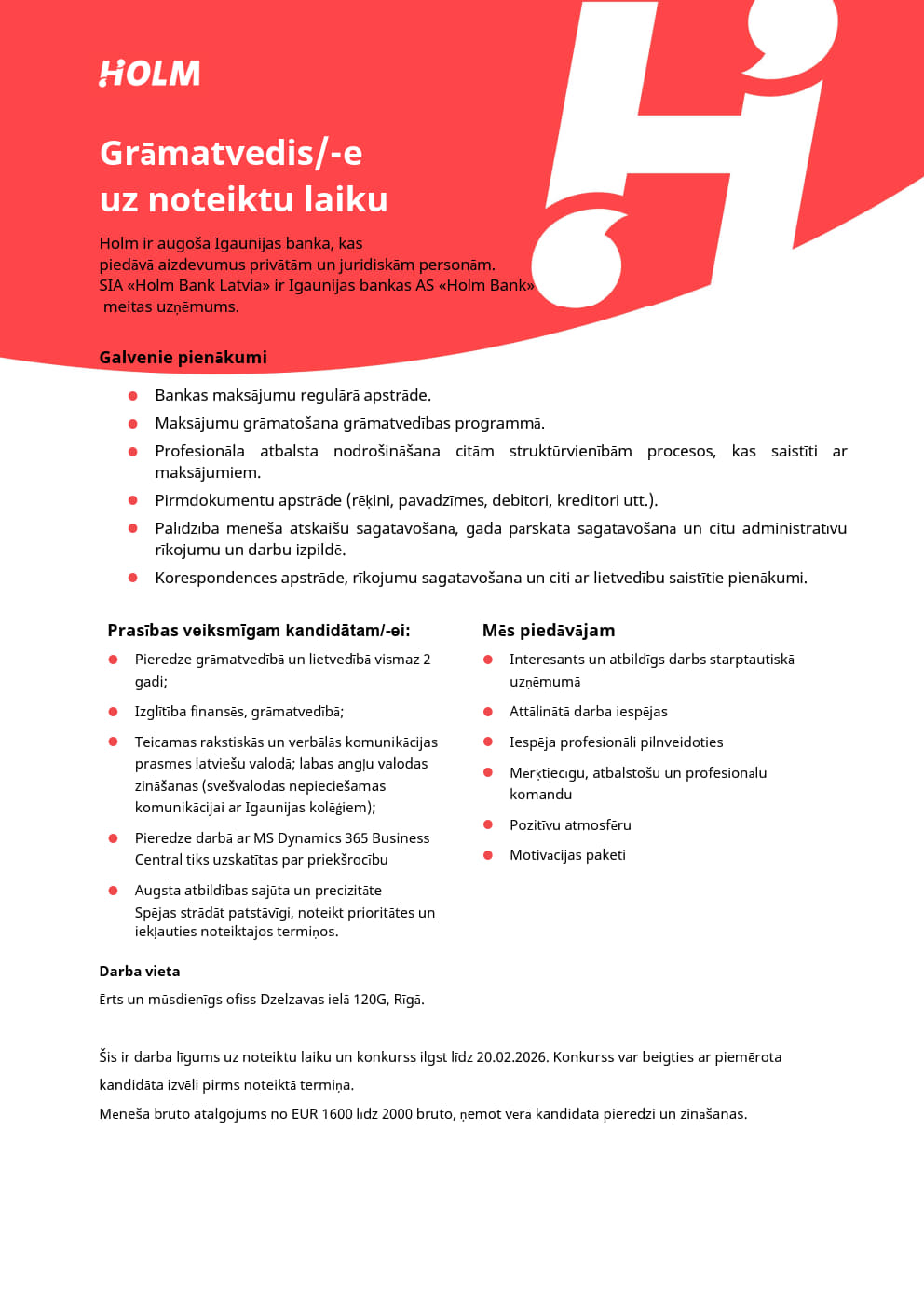Additional information: Mēneša bruto atalgojums no EUR 1600 līdz 2000 bruto, ņemot vērā kandidāta pieredzi un zināšanas.