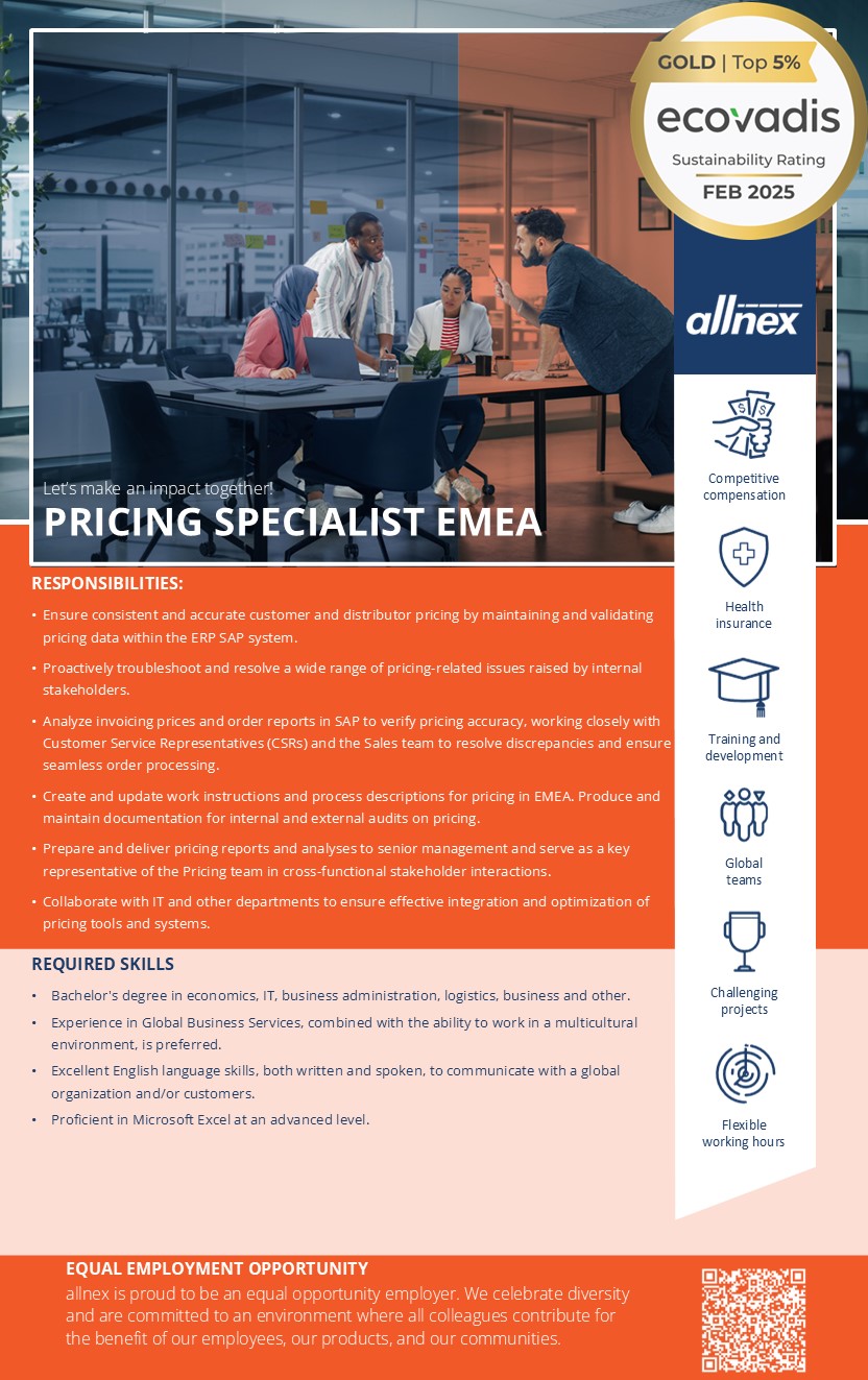 We are looking for an independent and analytical colleague to join our Pricing team. You will be responsible for running SAP invoicing reports to verify accurate customer billing and proper application of pricing deviations.