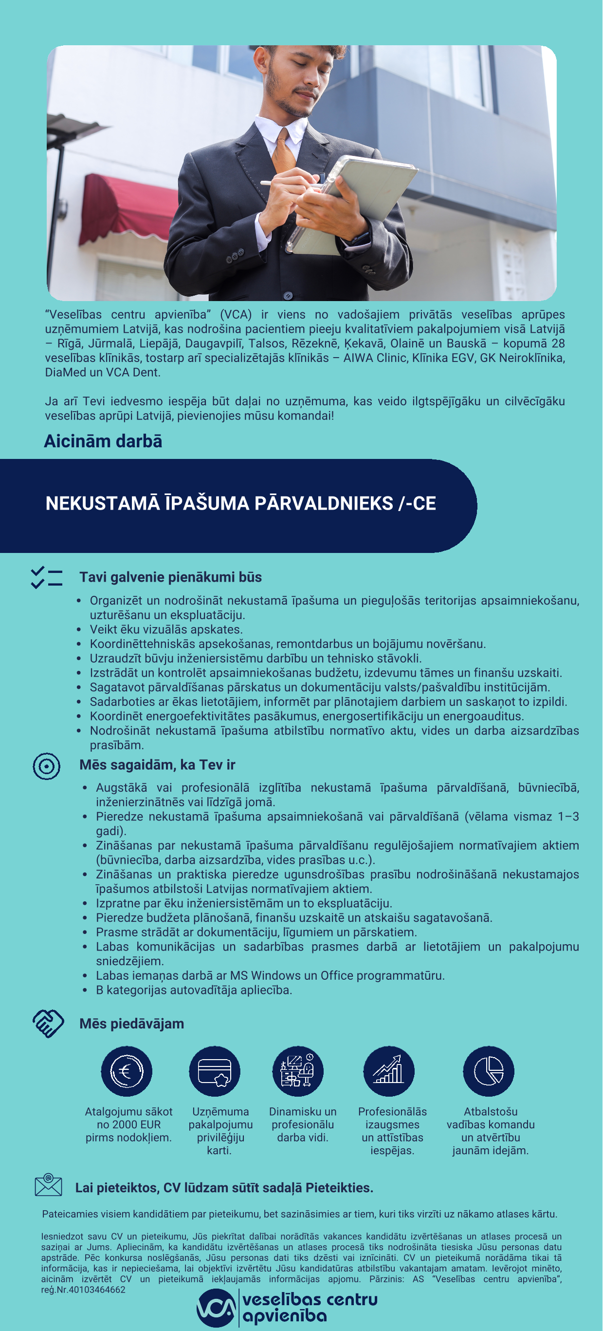 AS Veselības centru apvienība ir viens no pieejamākajiem veselības aprūpes tīkliem Latvijā, apvienojot 26 klīnikas gan primārās aprūpes iestādes, gan specializētās klīnikas, tostarp Aiwa Clinic, GK Neiroklīnika, EGV, Diamed un VCA Dent. Šī vienotā struktūra nodrošina pacientiem piekļuvi plašam un kvalitatīvam veselības pakalpojumu klāstam visā valstī. VCA pakalpojumu vērtību vēl vairāk palielina piederība AB City un Repharm grupai, kurā ietilpst arī Mēness aptieka, Centrālā laboratorija, kā arī zāļu un farmaceitisko produktu ražotāji, veidojot savstarpēji atbildīgu un pacientam ērtu veselības aprūpes ekosistēmu.