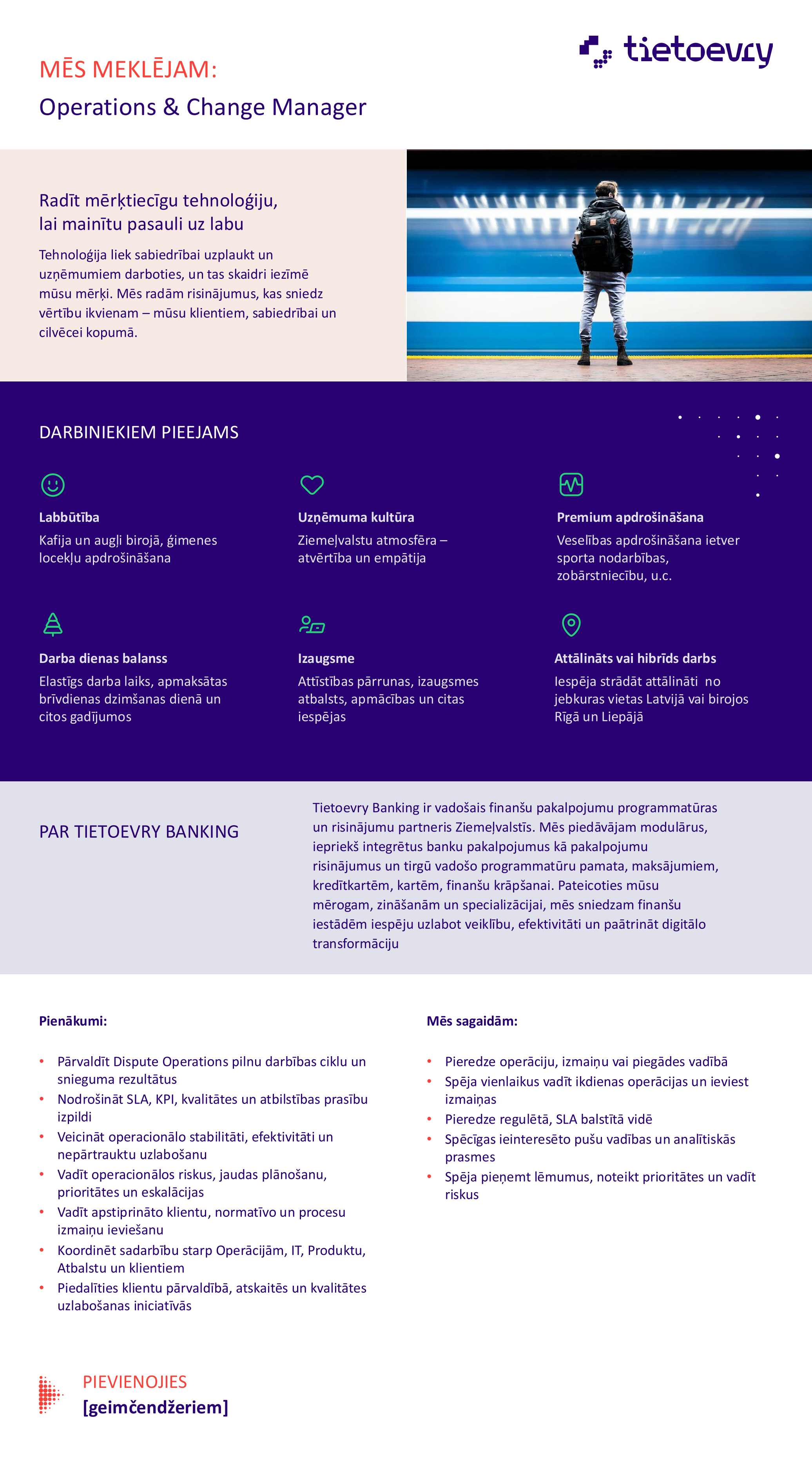 Šoreiz meklējam kolēģi SIA Tietoevry Banking. Vairāk nekā 400 ekspertu specializācija ir sarežģītu, apjomīgu un organizāciju ikdienai kritisku informācijas sistēmu izveide, ieviešana, uzturēšana, attīstīšana un konsultēšana.