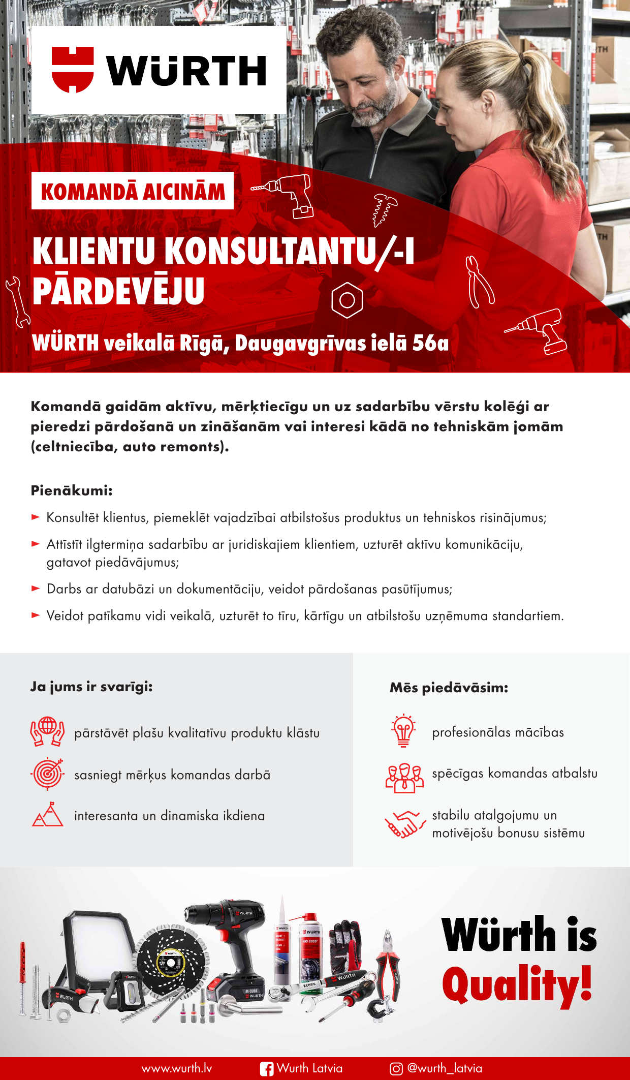 Klienti izvēlas Würth produktu kvalitātes, augsta līmeņa servisa un uzticamības dēļ. Pamata vērtība, ko piedāvājam saviem klientiem, ir ievērojams laika un resursu ietaupījums. Mūsu konsultanti ir tehniski zinoši un spēj piemeklēt risinājumu, kas atvieglo un padara efektīvāku darbu jebkurā ražotnē, darbnīcā, auto servisā vai celtniecības objektā. Tāpat nodrošinām preču piegādi tieši no ražotāja vai centrālās noliktavas, un 99% pasūtījumu piegādājam 24 stundu laikā.
