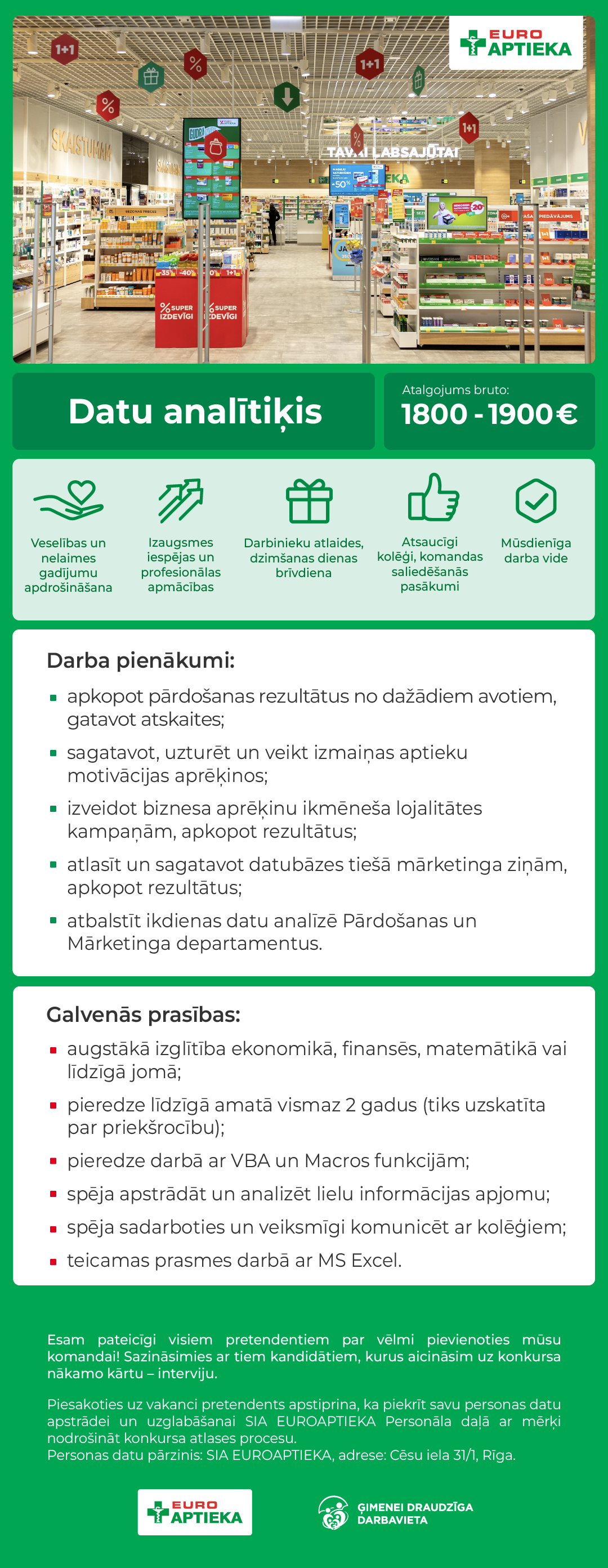 Iesniedzot savu pieteikumu, Jūs dodat piekrišanu SIA EUROAPTIEKA apstrādāt Jūsu iesniegtos personas datus norādītās vakances kandidātu izvērtēšanas un atlases procesā. Aicinām pieteikumā neiekļaut sensitīva rakstura informāciju, piemēram, informāciju par veselību. Datus uzglabāsim līdz 6 mēnešiem pēc pieteikšanās beigu termiņa. Savu piekrišanu Jums ir tiesības atsaukt jebkurā laikā, sazinoties ar pārzini: SIA EUROAPTIEKA, kontaktinformācija: Cēsu iela 31, k-1, Rīga, LV-1012, darbs@euroaptieka.lv. Papildu informācija par datu apstrādi pieejama https://www.euroaptieka.lv/par-mums/privatuma-politika/