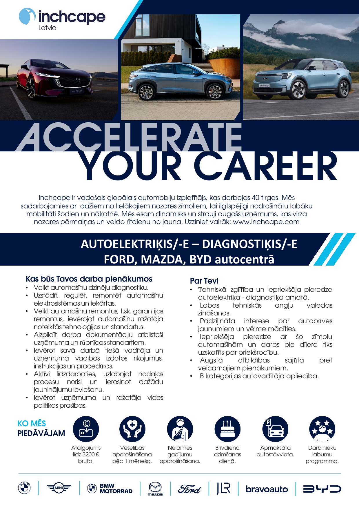 Inchcape ir viens no vadošajiem automobiļu izplatītājiem pasaulē, kas darbojas vairāk kā 40 tirgos. Mēs sadarbojamies ar lielākajiem automašīnu ražotājiem pasaulē, lai nodrošinātu cilvēkiem labāku mobilitāti šodien un nākotnē.Mūsu starptautiskā un daudzpusīgā komanda, kurā ir vairāk kā 20 000 talantīgu darbinieku, veido iekļaujošu un uz sadarbību vērstu uzņēmuma kultūru, sniedzot izcilu pieredzi mūsu klientiem un partneriem. Mēs esam dinamisks un strauji augošs uzņēmums, kura mērķis ir veidot veiksmīgu un ilgtspējīgu nozares nākotni.Šeit jūs varēsiet pilnveidot savu potenciālu, izmantojot sniegtās karjeras iespējas un gūstot mācīšanās pieredzi. Jums būs iespēja strādāt ar modernākajām tehnoloģijām, visjaunākajām inovācijām un progresīvi domājošiem kolēģiem. Ja esat mērķtiecīgs, uz panākumiem vērsts un spējat parādīt labāko sevī un citos, tad pievienojieties mums, lai radītu jaunu nākotni.Inchcape Lativjā ir oficiālais pārstāvis tādiem automašīnu zīmoliem kā Ford, Mazda, Jaguar, Land Rover, BMW, MINI, kā arī motociklu zīmolam BMW Motorrad.Inchcape mērķis ir NODROŠINĀT MOBILITĀTI PASAULES KOPIENĀM ŠODIENAI, RĪTDIENAI UN LABĀKAI DZĪVEI!