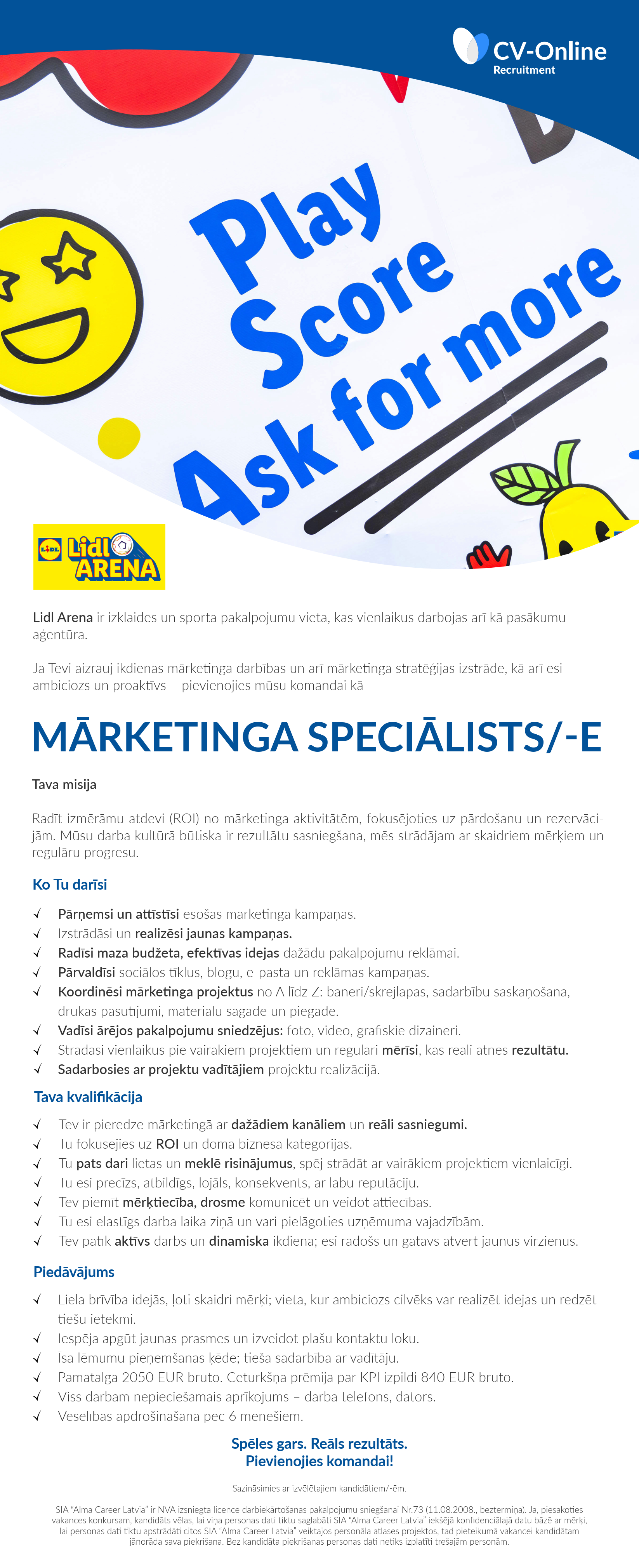 Additional information: Pamatalga 2050 EUR bruto. Ceturkšņa prēmija par KPI izpildi 840 EUR bruto.