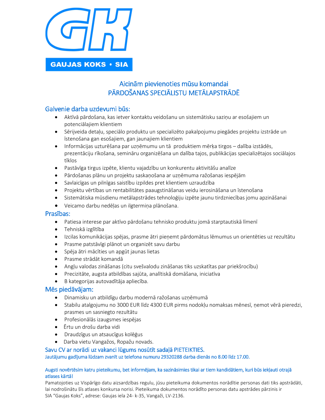 Palielinoties darbības apjomiem, aicinām pievienoties mūsu komandai kompetentus, motivētus, enerģiskus un zinošus cilvēkus.