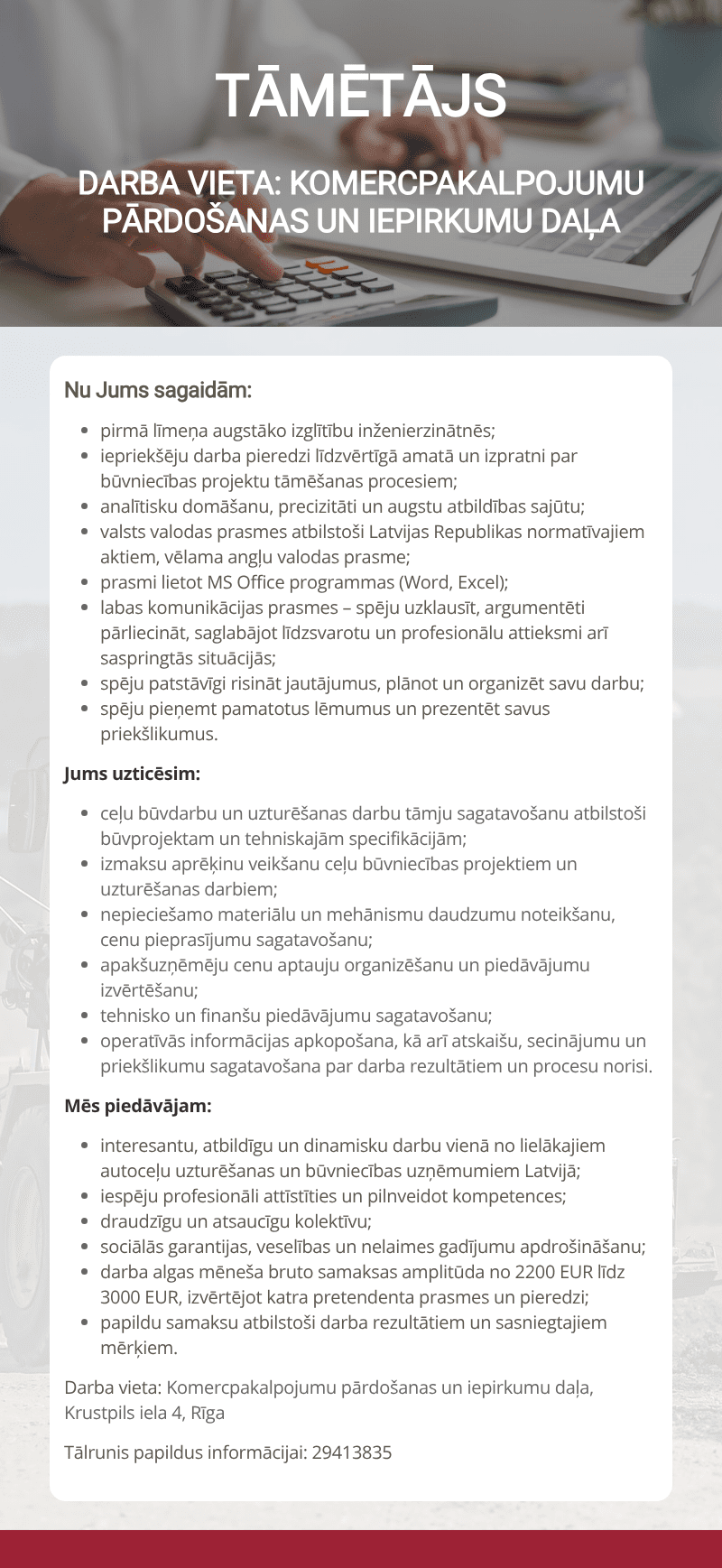 Additional information: Darba algas mēneša bruto samaksas amplitūda no 2200 EUR līdz 3000 EUR, izvērtējot katra pretendenta prasmes un pieredzi.