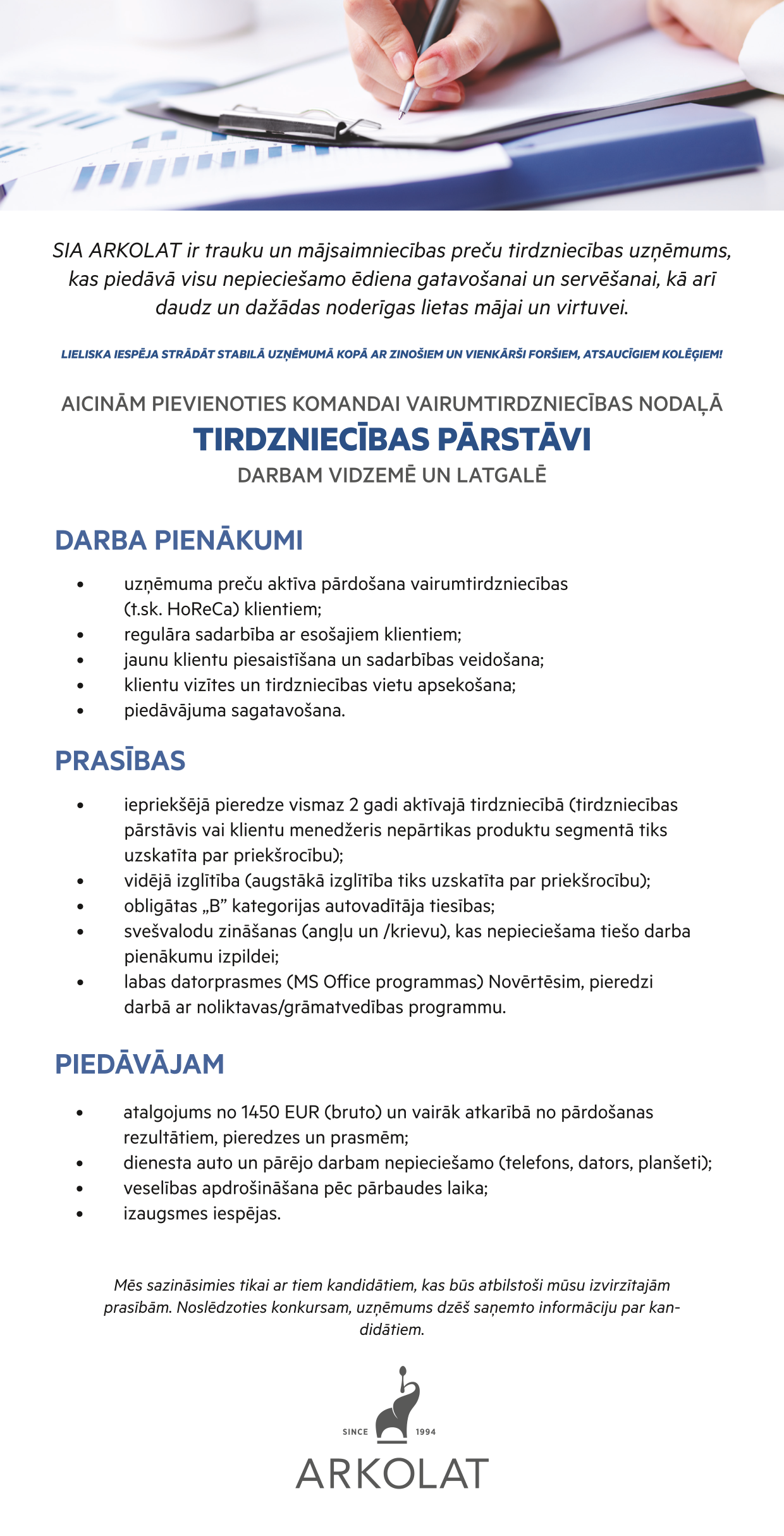 Additional information: atalgojums no 1450 EUR (bruto) un vairāk atkarībā no pārdošanas rezultātiem, pieredzes un prasmēm;