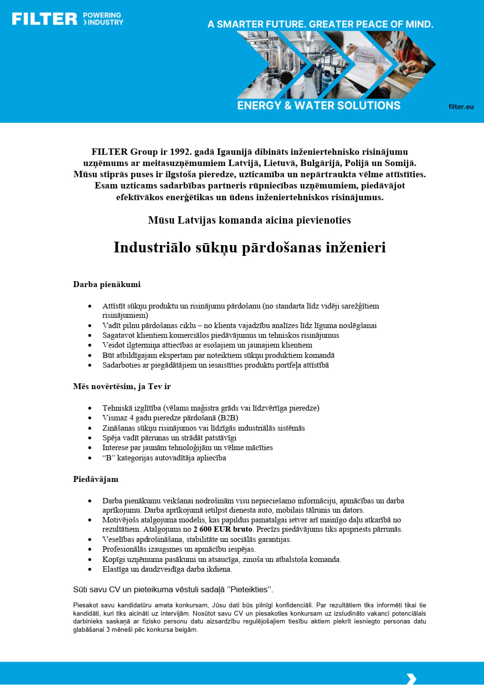 Additional information: Motivējošs atalgojuma modelis, kas papildus pamatalgai ietver arī mainīgo daļu atkarībā no rezultātiem. Atalgojums no 2 600 EUR bruto. Precīzs piedāvājums tiks apspriests pārrunās.