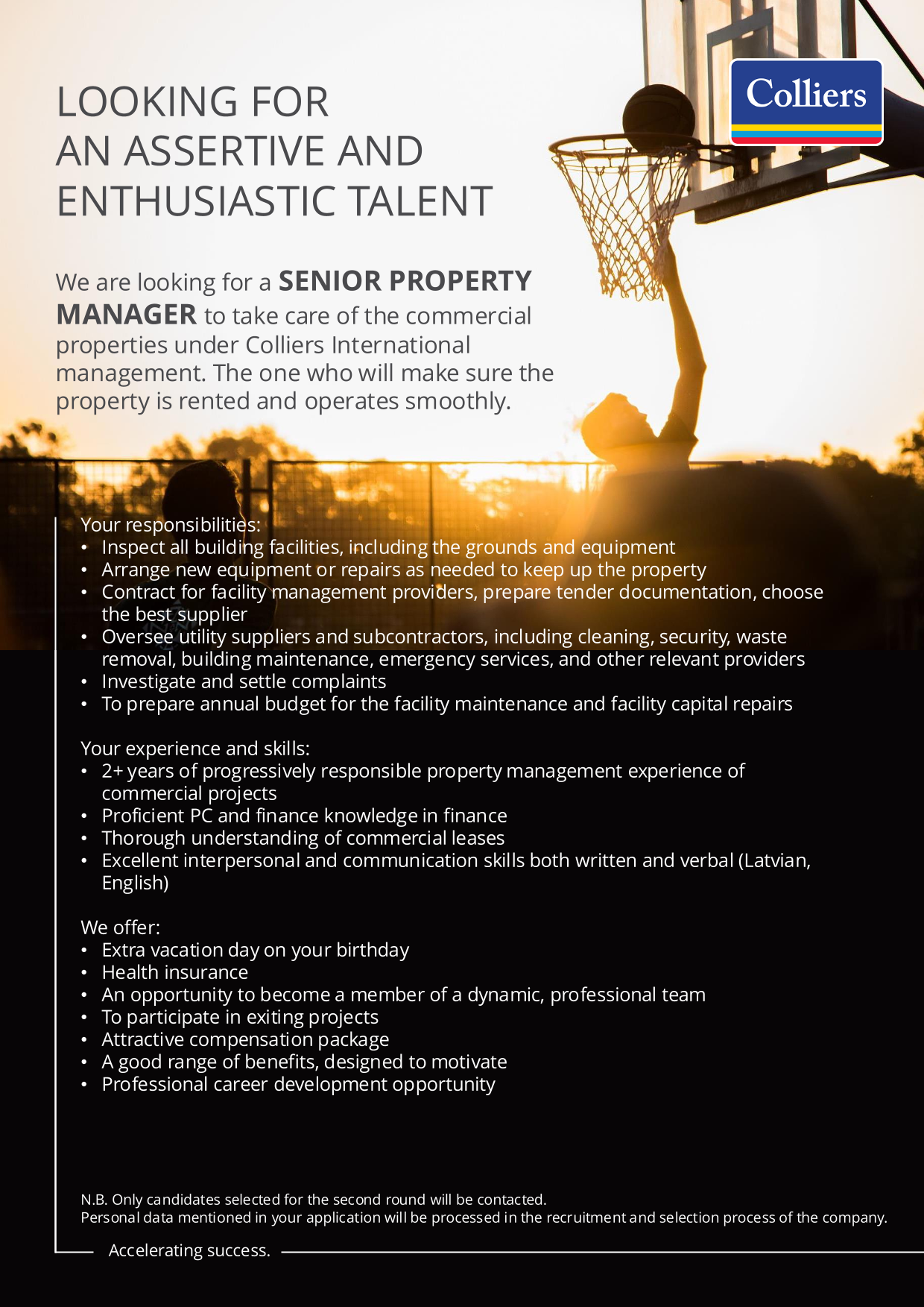 Additional information: No 2500.00 EUR līdz 2800.00 EUR bruto mēnesī, veselības apdrošināšana pēc pārbaudes laika, attīstības un izaugsmes iespējas. Algas līmenis atkarīgs no kandidāta iepriekšējās darba pieredzes, prasmēm un atbilstības prasībām.