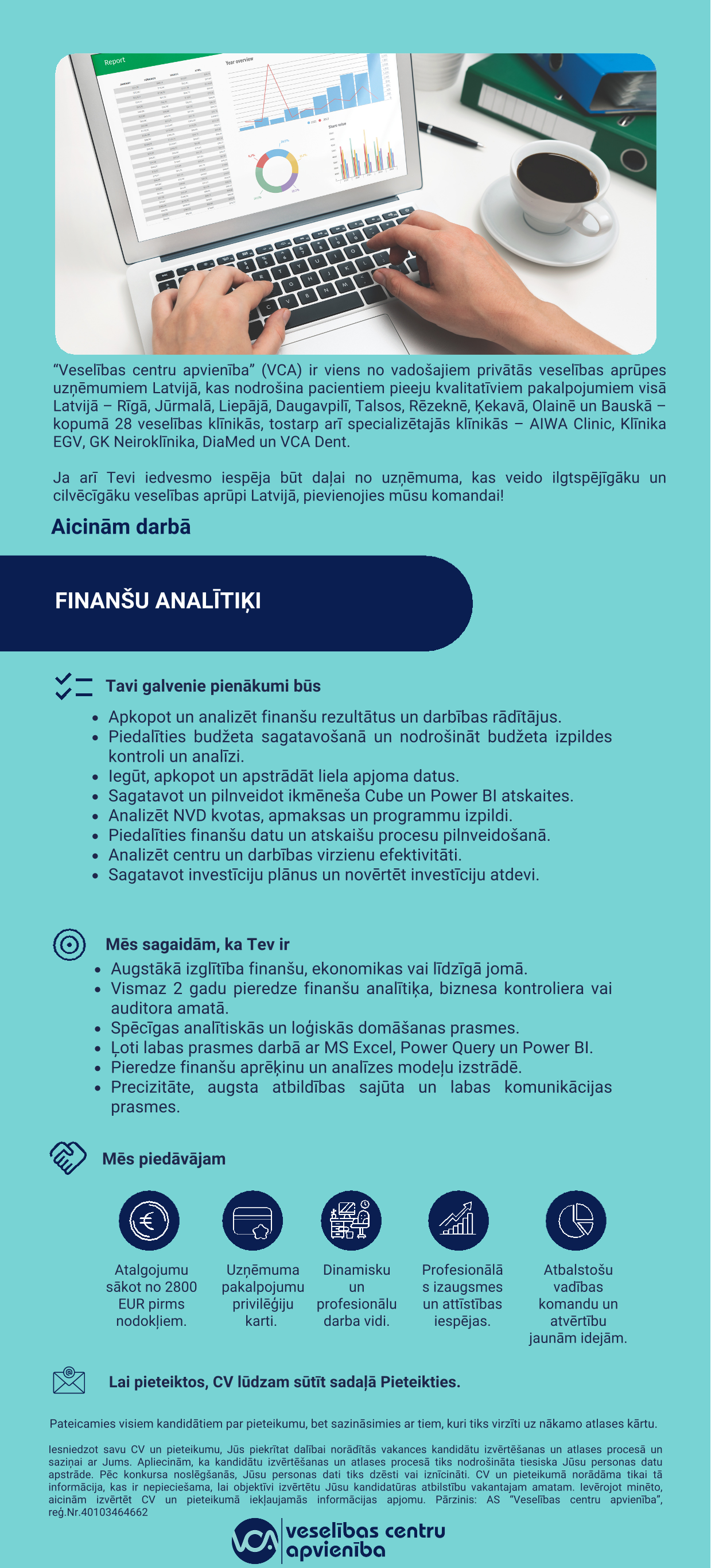 AS Veselības centru apvienība ir viens no pieejamākajiem veselības aprūpes tīkliem Latvijā, apvienojot 26 klīnikas gan primārās aprūpes iestādes, gan specializētās klīnikas, tostarp Aiwa Clinic, GK Neiroklīnika, EGV, Diamed un VCA Dent. Šī vienotā struktūra nodrošina pacientiem piekļuvi plašam un kvalitatīvam veselības pakalpojumu klāstam visā valstī. VCA pakalpojumu vērtību vēl vairāk palielina piederība AB City un Repharm grupai, kurā ietilpst arī Mēness aptieka, Centrālā laboratorija, kā arī zāļu un farmaceitisko produktu ražotāji, veidojot savstarpēji atbildīgu un pacientam ērtu veselības aprūpes ekosistēmu.