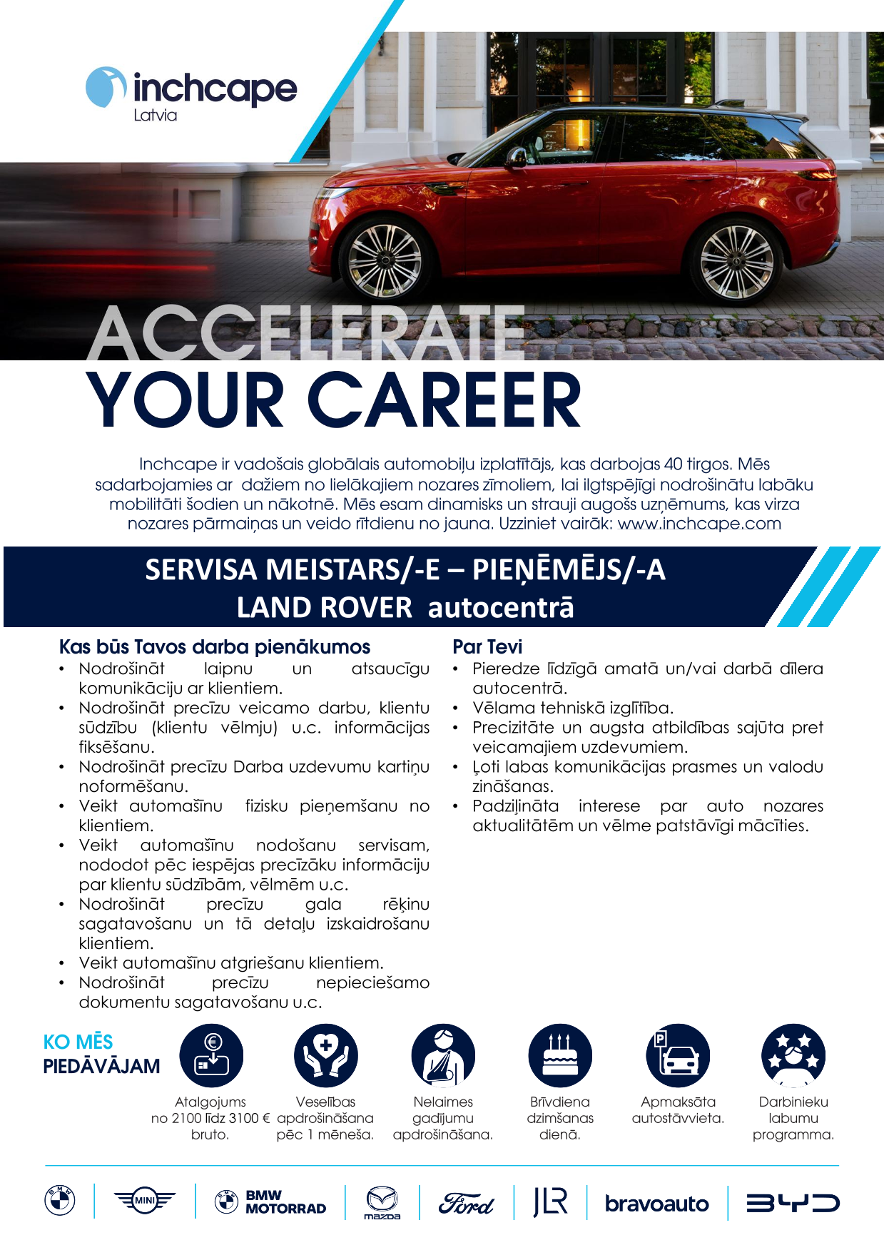 Inchcape ir viens no vadošajiem automobiļu izplatītājiem pasaulē, kas darbojas vairāk kā 40 tirgos. Mēs sadarbojamies ar lielākajiem automašīnu ražotājiem pasaulē, lai nodrošinātu cilvēkiem labāku mobilitāti šodien un nākotnē.Mūsu starptautiskā un daudzpusīgā komanda, kurā ir vairāk kā 20 000 talantīgu darbinieku, veido iekļaujošu un uz sadarbību vērstu uzņēmuma kultūru, sniedzot izcilu pieredzi mūsu klientiem un partneriem. Mēs esam dinamisks un strauji augošs uzņēmums, kura mērķis ir veidot veiksmīgu un ilgtspējīgu nozares nākotni.Šeit jūs varēsiet pilnveidot savu potenciālu, izmantojot sniegtās karjeras iespējas un gūstot mācīšanās pieredzi. Jums būs iespēja strādāt ar modernākajām tehnoloģijām, visjaunākajām inovācijām un progresīvi domājošiem kolēģiem. Ja esat mērķtiecīgs, uz panākumiem vērsts un spējat parādīt labāko sevī un citos, tad pievienojieties mums, lai radītu jaunu nākotni.Inchcape Lativjā ir oficiālais pārstāvis tādiem automašīnu zīmoliem kā Ford, Mazda, Jaguar, Land Rover, BMW, MINI, kā arī motociklu zīmolam BMW Motorrad.Inchcape mērķis ir NODROŠINĀT MOBILITĀTI PASAULES KOPIENĀM ŠODIENAI, RĪTDIENAI UN LABĀKAI DZĪVEI!
