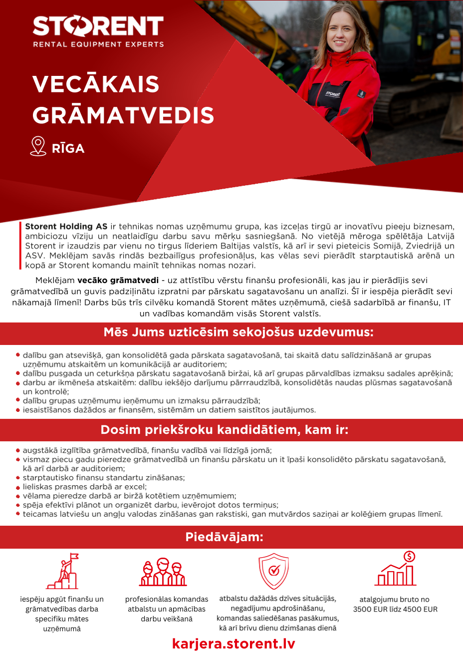 STORENT grupa ir tehnikas nomas uzņēmums, kas ar ievērojamiem panākumiem darbojas Baltijas reģionā, Zviedrijā un Somijā. Zinām, ka stipru komandu veido spēcīgas personības un stabilas uzņēmuma vērtības. Ja darbs lielā, starptautiskā uzņēmumā, kas balstās profesionalitātē, kvalitātē un izcilā klientu servisā, liek Tavām acīm mirdzēt, iespējams, Tava vieta ir mūsu vidū.