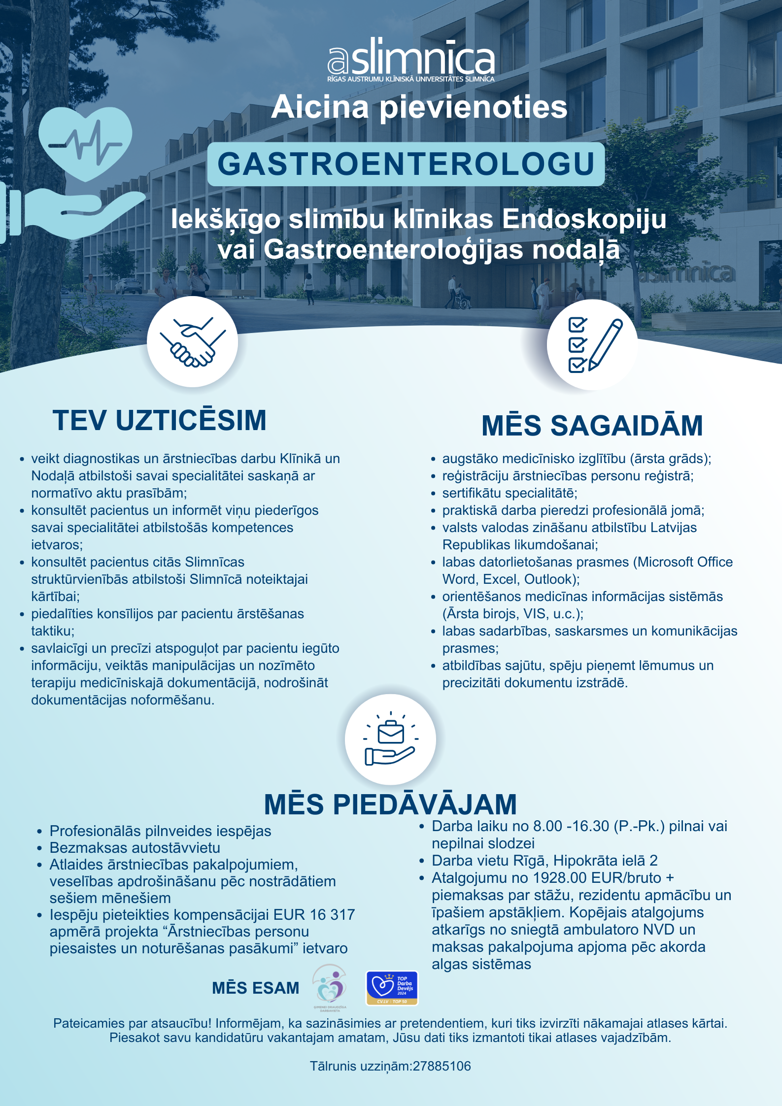 Aicinām pievienoties mūsu profesionāļu komandai, izvēloties sev atbilstošu vakanci kādā no slimnīcas stacionāriem un Jūs iegūsiet darbu vienā no Latvijas lielākajiem un stabilākajiem uzņēmumiem.
