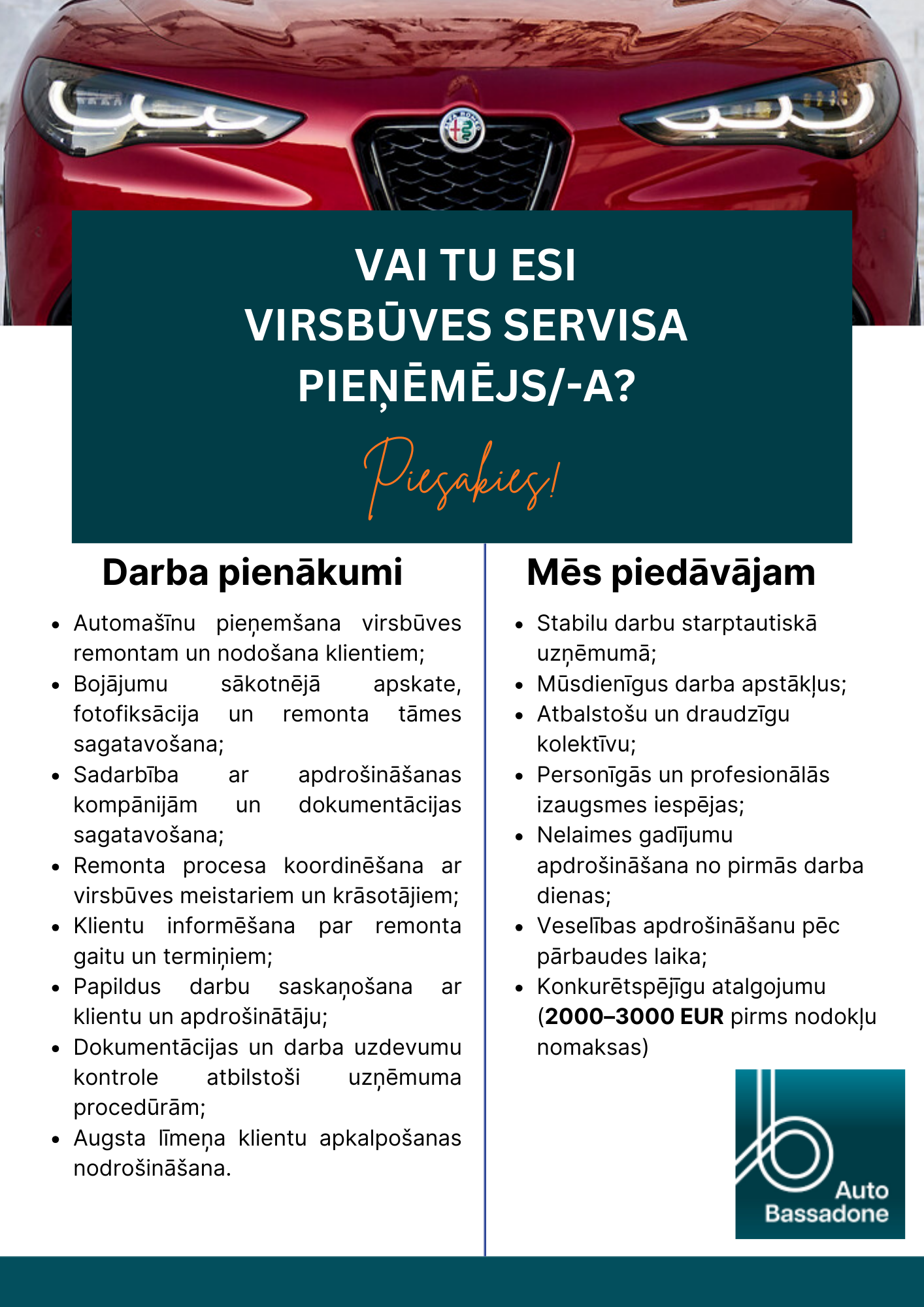 - Vidējā vai profesionālā izglītība. Pieredze ar auto virsbūves remontiem vai izglītība auto remonta nozarē tiks uzskatīta par priekšrocību;