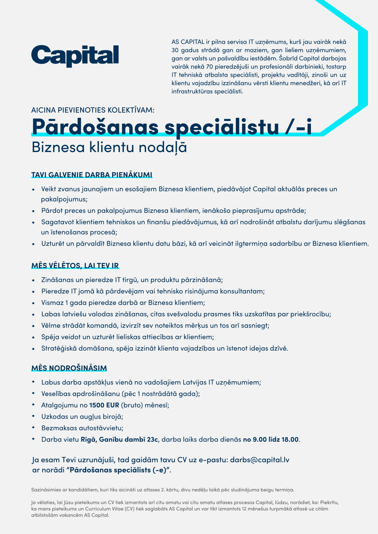 AS CAPITAL ir pilna servisa IT uzņēmums, kurš jau vairāk nekā 30 gadus strādā gan ar maziem, gan lieliem uzņēmumiem, gan ar valsts un pašvaldību iestādēm. Šobrīd Capital darbojas vairāk nekā 70 pieredzējuši un profesionāli darbinieki, tostarp IT tehniskā atbalsta speciālisti, projektu vadītāji, zinoši un uz klientu vajadzību izzināšanu vērsti klientu menedžeri, kā arī IT infrastruktūras speciālisti.
