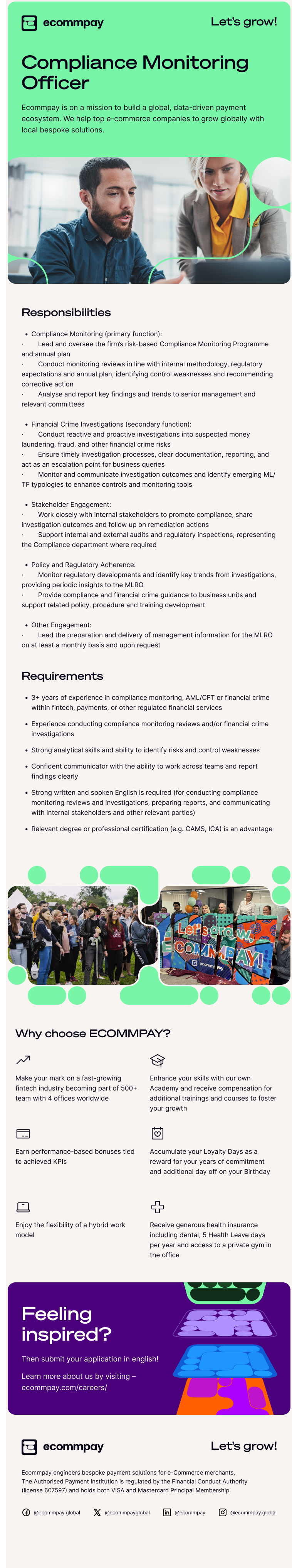 Ecommpay is a payment service provider and a direct bank card acquirer. As thrilling experts, not only do we work hard to create tailor-made, data-driven technologies for our clients, we also grow their businesses and ours, leading courageously and sharing our knowledge within the fast-growing fintech community. Our payment gateway facilitates an omnichannel payment process, combining acquiring capabilities, 100+ payment methods, mass payouts, and technological innovation within a single, seamless integration. Our fintech ecosystem is run by over 500 driven professionals who dream big and strive for excellence across 4 global offices. The thing that matters most is our people with diverse and courageous minds and extraordinary results that we achieve together. We have built a dynamic and fun environment where you can feel surrounded by energetic people and inspiring leaders involved in challenging international projects. We are always looking for bright talents. If you can evolve with speed, take rapid action and optimistically conquer challenges at every corner, then join us and help to steer the growth of our payment solutions and become a driving force at Ecommpay.