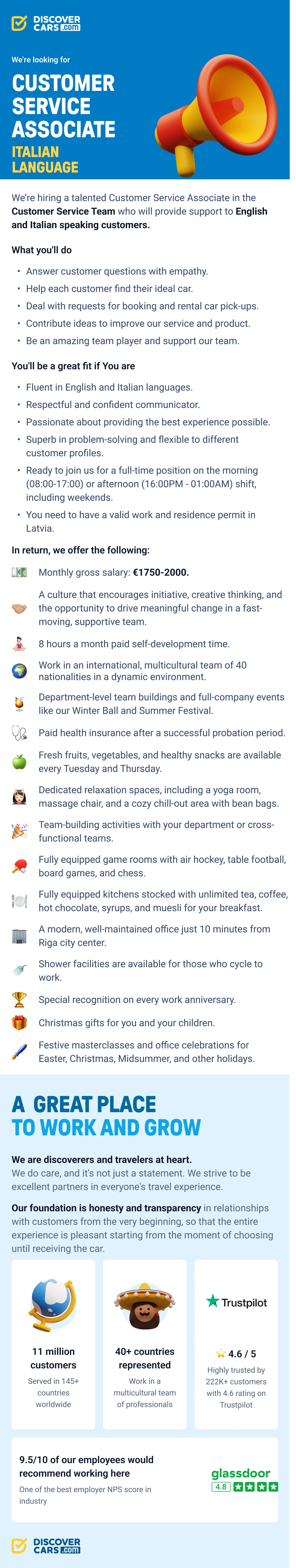 DiscoverCars.com, one of the fastest-growing companies in Europe, according to the Financial Times, seeks to be a world leader in online car rental reservations. Serving more than 10k locations in 145 countries, our company is constantly adding new partners in new locations and pushing for the best prices and service for our customers.
