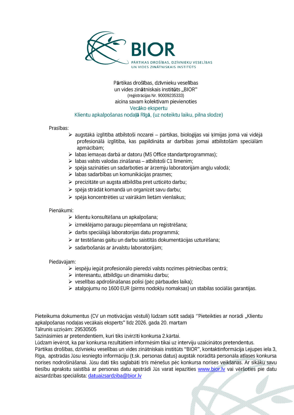 Institūts "BIOR" ir starptautiski konkurētspējīgs valsts nozīmes pētniecības centrs, kas izstrādā inovatīvas pētniecības metodes, rada jaunas praktiski pielietojamas zināšanas sabiedrības un vides veselības, pārtikas, zivsaimniecības un veterinārmedicīnas zinātņu jomā.