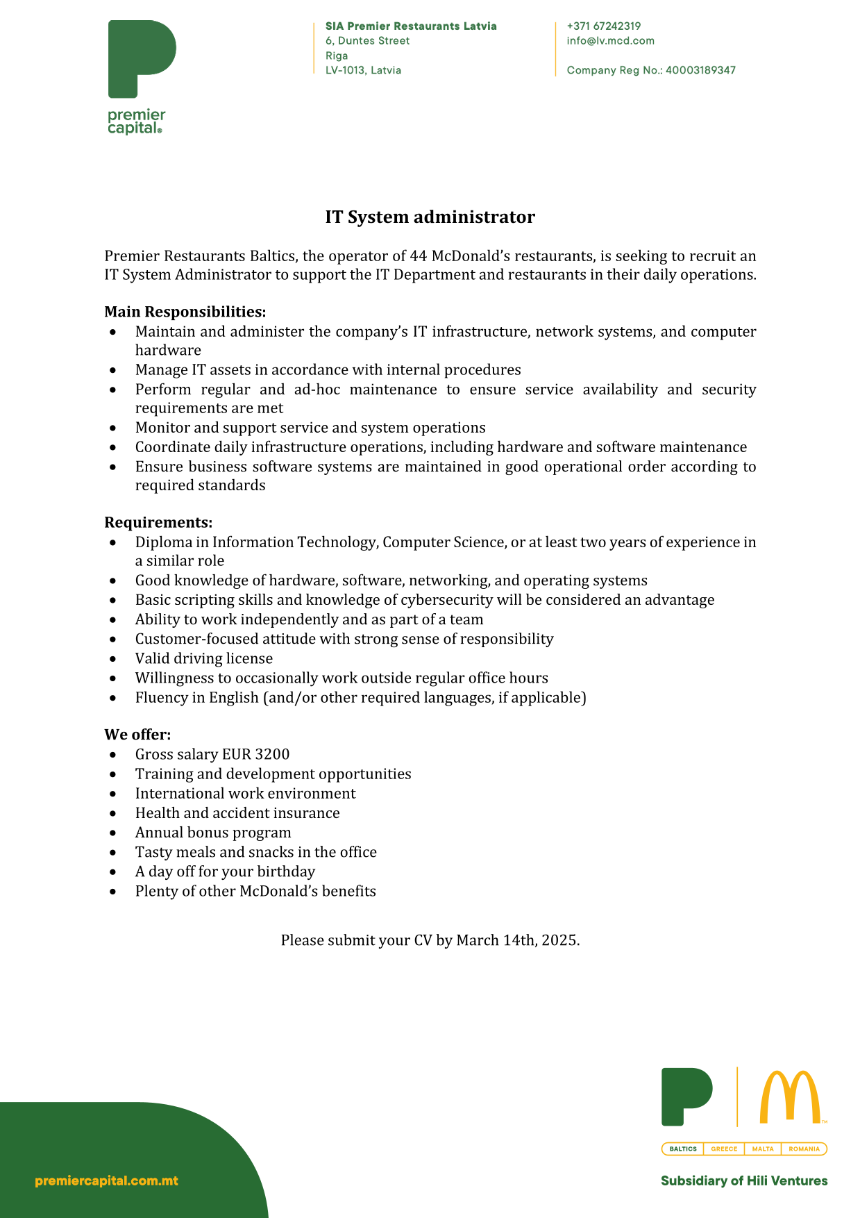 Premier Restaurants Latvia SIA ir McDonalds® restorānu operators Latvijā un ietilpst Premier Capital divīzijā. McDonalds Attīstības licences turētājai Maltas kompānijai Premier Capital pieder 185 McDonalds restorāni Baltijas valstīs, Maltā, Grieķijā un Rumānijā. Latvijā pirmais McDonalds® vēra durvis 1994. gadā, bet šobrīd esam izauguši līdz 13 restorāniem Rīgā un vienu Jelgavā, to skaitā astoņi restorāni ar McDrive un četri McCafé. McDonalds® Latvijā restorānos nodarbina vairāk nekā 700 cilvēku un apkalpo vairāk nekā 20 000 apmeklētāju dienā.