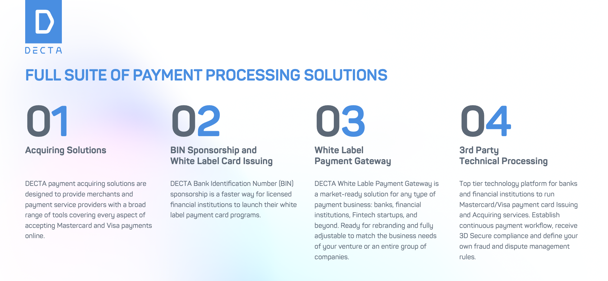 and Visa networks, DECTA offers services to banks, payment service providers, and