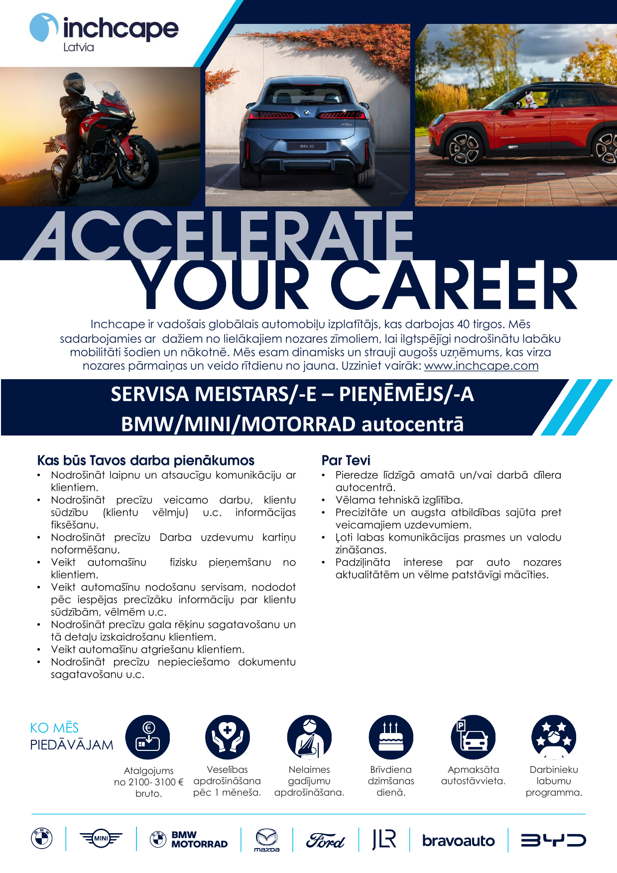 Inchcape ir viens no vadošajiem automobiļu izplatītājiem pasaulē, kas darbojas vairāk kā 40 tirgos. Mēs sadarbojamies ar lielākajiem automašīnu ražotājiem pasaulē, lai nodrošinātu cilvēkiem labāku mobilitāti šodien un nākotnē.Mūsu starptautiskā un daudzpusīgā komanda, kurā ir vairāk kā 20 000 talantīgu darbinieku, veido iekļaujošu un uz sadarbību vērstu uzņēmuma kultūru, sniedzot izcilu pieredzi mūsu klientiem un partneriem. Mēs esam dinamisks un strauji augošs uzņēmums, kura mērķis ir veidot veiksmīgu un ilgtspējīgu nozares nākotni.Šeit jūs varēsiet pilnveidot savu potenciālu, izmantojot sniegtās karjeras iespējas un gūstot mācīšanās pieredzi. Jums būs iespēja strādāt ar modernākajām tehnoloģijām, visjaunākajām inovācijām un progresīvi domājošiem kolēģiem. Ja esat mērķtiecīgs, uz panākumiem vērsts un spējat parādīt labāko sevī un citos, tad pievienojieties mums, lai radītu jaunu nākotni.Inchcape Lativjā ir oficiālais pārstāvis tādiem automašīnu zīmoliem kā Ford, Mazda, Jaguar, Land Rover, BMW, MINI, kā arī motociklu zīmolam BMW Motorrad.Inchcape mērķis ir NODROŠINĀT MOBILITĀTI PASAULES KOPIENĀM ŠODIENAI, RĪTDIENAI UN LABĀKAI DZĪVEI!