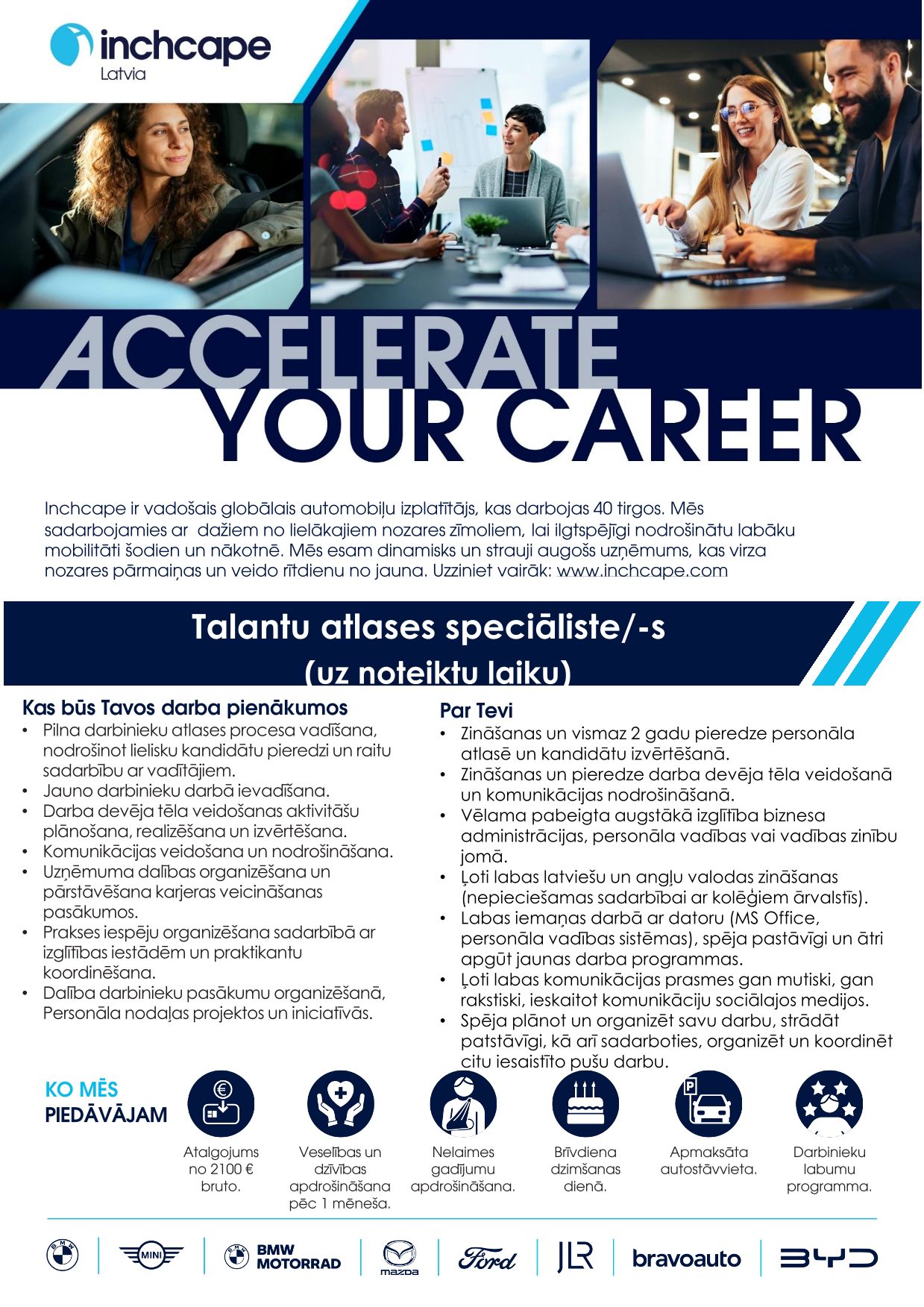 Inchcape ir viens no vadošajiem automobiļu izplatītājiem pasaulē, kas darbojas vairāk kā 40 tirgos. Mēs sadarbojamies ar lielākajiem automašīnu ražotājiem pasaulē, lai nodrošinātu cilvēkiem labāku mobilitāti šodien un nākotnē.Mūsu starptautiskā un daudzpusīgā komanda, kurā ir vairāk kā 20 000 talantīgu darbinieku, veido iekļaujošu un uz sadarbību vērstu uzņēmuma kultūru, sniedzot izcilu pieredzi mūsu klientiem un partneriem. Mēs esam dinamisks un strauji augošs uzņēmums, kura mērķis ir veidot veiksmīgu un ilgtspējīgu nozares nākotni.Šeit jūs varēsiet pilnveidot savu potenciālu, izmantojot sniegtās karjeras iespējas un gūstot mācīšanās pieredzi. Jums būs iespēja strādāt ar modernākajām tehnoloģijām, visjaunākajām inovācijām un progresīvi domājošiem kolēģiem. Ja esat mērķtiecīgs, uz panākumiem vērsts un spējat parādīt labāko sevī un citos, tad pievienojieties mums, lai radītu jaunu nākotni.Inchcape Lativjā ir oficiālais pārstāvis tādiem automašīnu zīmoliem kā Ford, Mazda, Jaguar, Land Rover, BMW, MINI, kā arī motociklu zīmolam BMW Motorrad.Inchcape mērķis ir NODROŠINĀT MOBILITĀTI PASAULES KOPIENĀM ŠODIENAI, RĪTDIENAI UN LABĀKAI DZĪVEI!