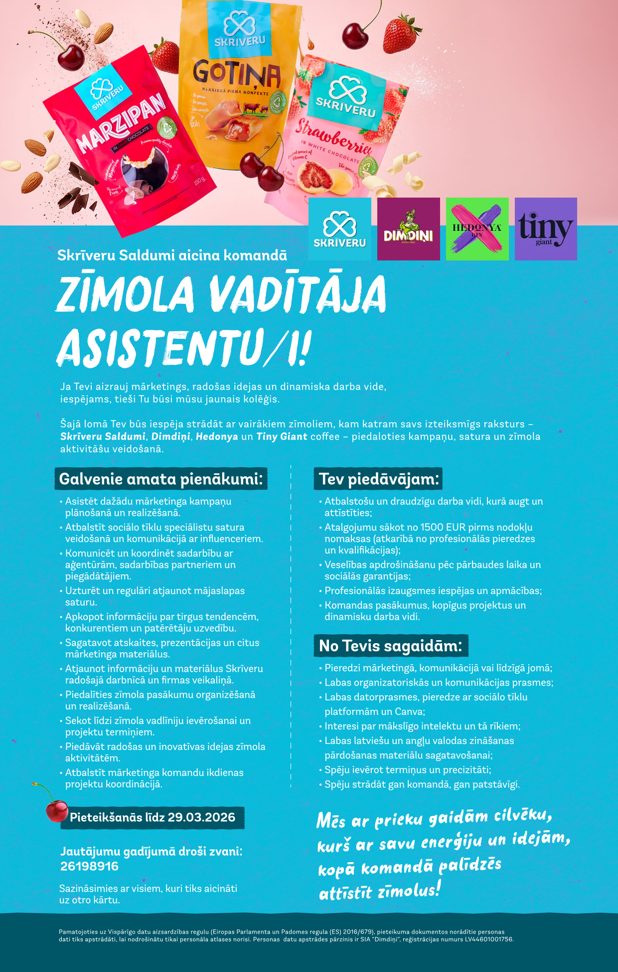 Apvieno veselīgo ar saldo - tas ir stāsts par mums! Mēs esam Latvijas ražotājs - ģimenes uzņēmums. Esam profesionāļu komanda, ar saldumu ražošanas pieredzi jau no 1956 gada! Tā kā mūsu moto ir apvienot veselīgo ar saldo, tad produkcijas ražošanā izmantojam tikai augstas kvalitātes izejvielas. Lielākā daļa mūsu produktu ir dabīgi un nesatur glutēnu. Mēs ražojam: Iecienītās un tradicionālās piena konfektes " Skrīveru Gotiņas" roku darba izpildījumā: Mīksto un putoto īrisu jeb toffee; Žāvētos augļus, riekstus un ogas šokolādē; Īstā mandeļriekstu marcipāna konfektes; Musli un sēkliņu l...