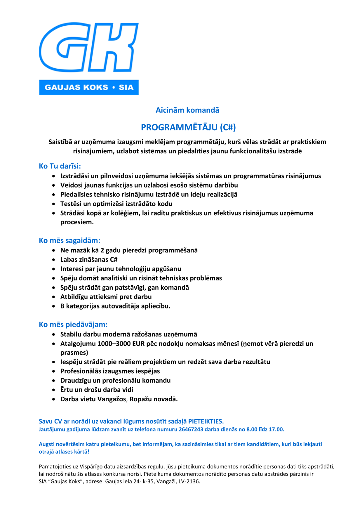 Palielinoties darbības apjomiem, aicinām pievienoties mūsu komandai kompetentus, motivētus, enerģiskus un zinošus cilvēkus.