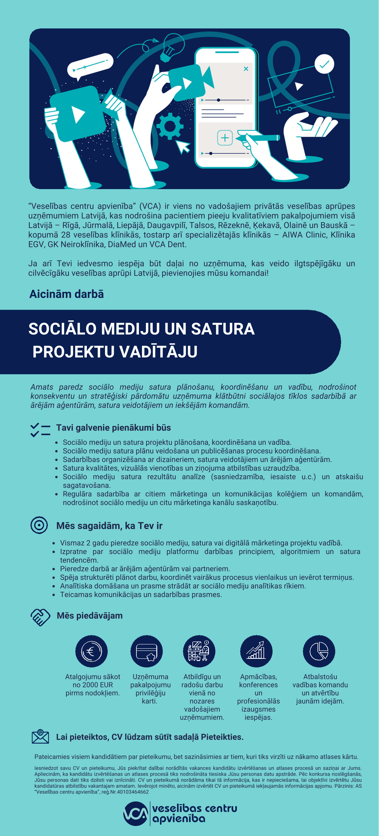 AS Veselības centru apvienība ir viens no pieejamākajiem veselības aprūpes tīkliem Latvijā, apvienojot 26 klīnikas gan primārās aprūpes iestādes, gan specializētās klīnikas, tostarp Aiwa Clinic, GK Neiroklīnika, EGV, Diamed un VCA Dent. Šī vienotā struktūra nodrošina pacientiem piekļuvi plašam un kvalitatīvam veselības pakalpojumu klāstam visā valstī. VCA pakalpojumu vērtību vēl vairāk palielina piederība AB City un Repharm grupai, kurā ietilpst arī Mēness aptieka, Centrālā laboratorija, kā arī zāļu un farmaceitisko produktu ražotāji, veidojot savstarpēji atbildīgu un pacientam ērtu veselības aprūpes ekosistēmu.