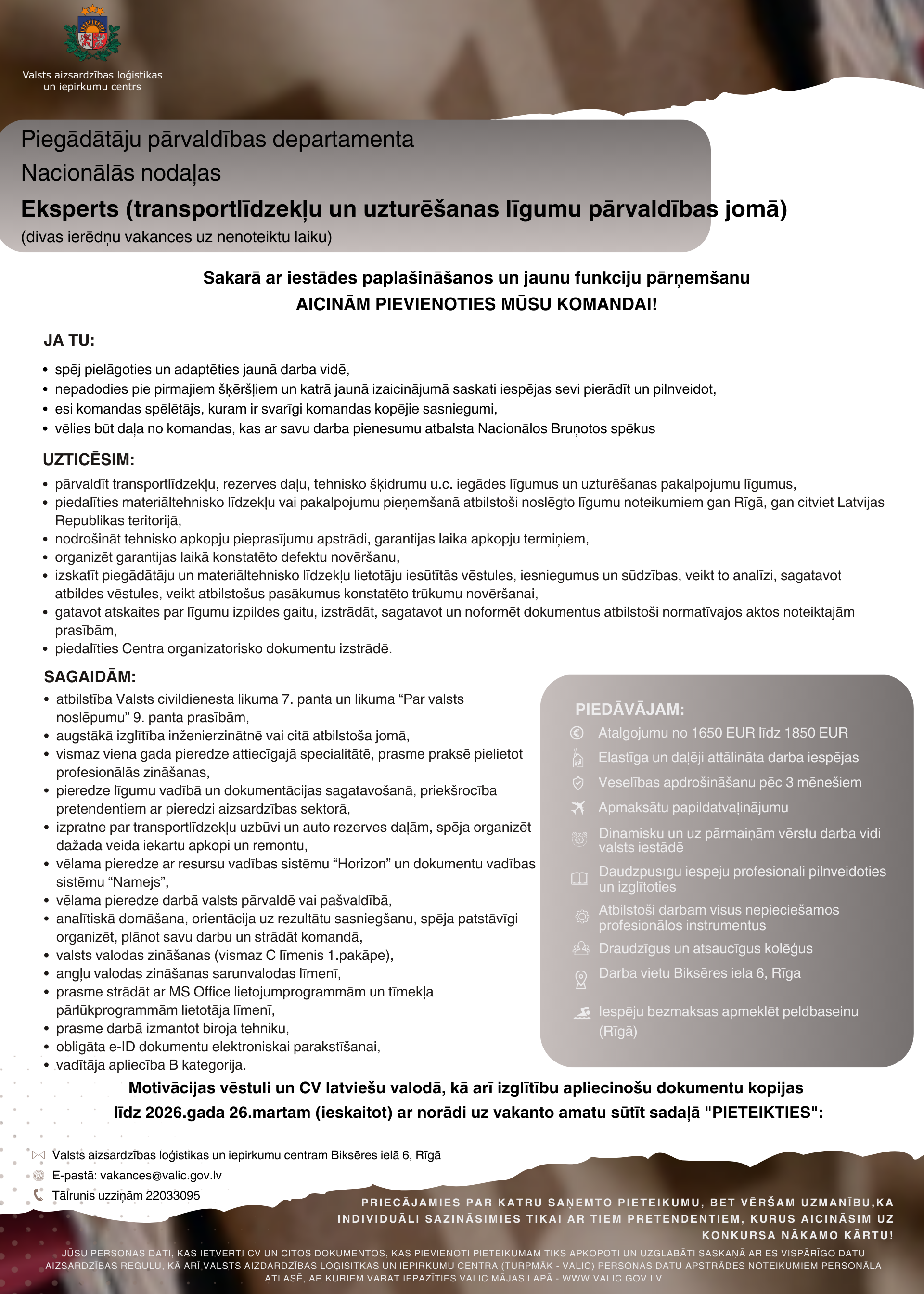 Valsts aizsardzības loģistikas un iepirkumu centrs (VALIC) ir Aizsardzības ministrijas tiešā pakļautībā esoša iestāde, kas izveidota 2021.gada 1.janvārī ar mērķi nodrošināt pilnu materiāltehnisko līdzekļu (MTL) dzīves cikla pārvaldību un centralizētu iepirkumu veikšanu visā aizsardzības nozarē. VALIC galvenā atbildība ir nodrošināt, ka Nacionālo bruņoto spēku (NBS) vajadzības tiek nodrošinātas efektīvi – nepārtraukti, pareizā laikā un apjomā.Šobrīd tiek īstenota nodrošinājuma reforma, kas ir visaptverošs process Aizsardzības resorā. Viens no galvenajiem mērķiem ir modernizēt un centralizēt nodrošinājuma sistēmu, pakāpeniski pārņemot civilās funkcijas no NBS, tādejādi atbrīvojot NBS karavīrus no administratīvajiem un saimnieciskajiem uzdevumiem, piemēram, iepirkumiem, līgumu administrēšanas un apmaksas veikšanas.Šo funkciju nodošana VALIC ļauj karavīriem pilnībā koncentrēties uz saviem tiešajiem militārajiem pienākumiem - kaujas apmācībām, operācijām un sagatavošanos valsts aizsardzībai.