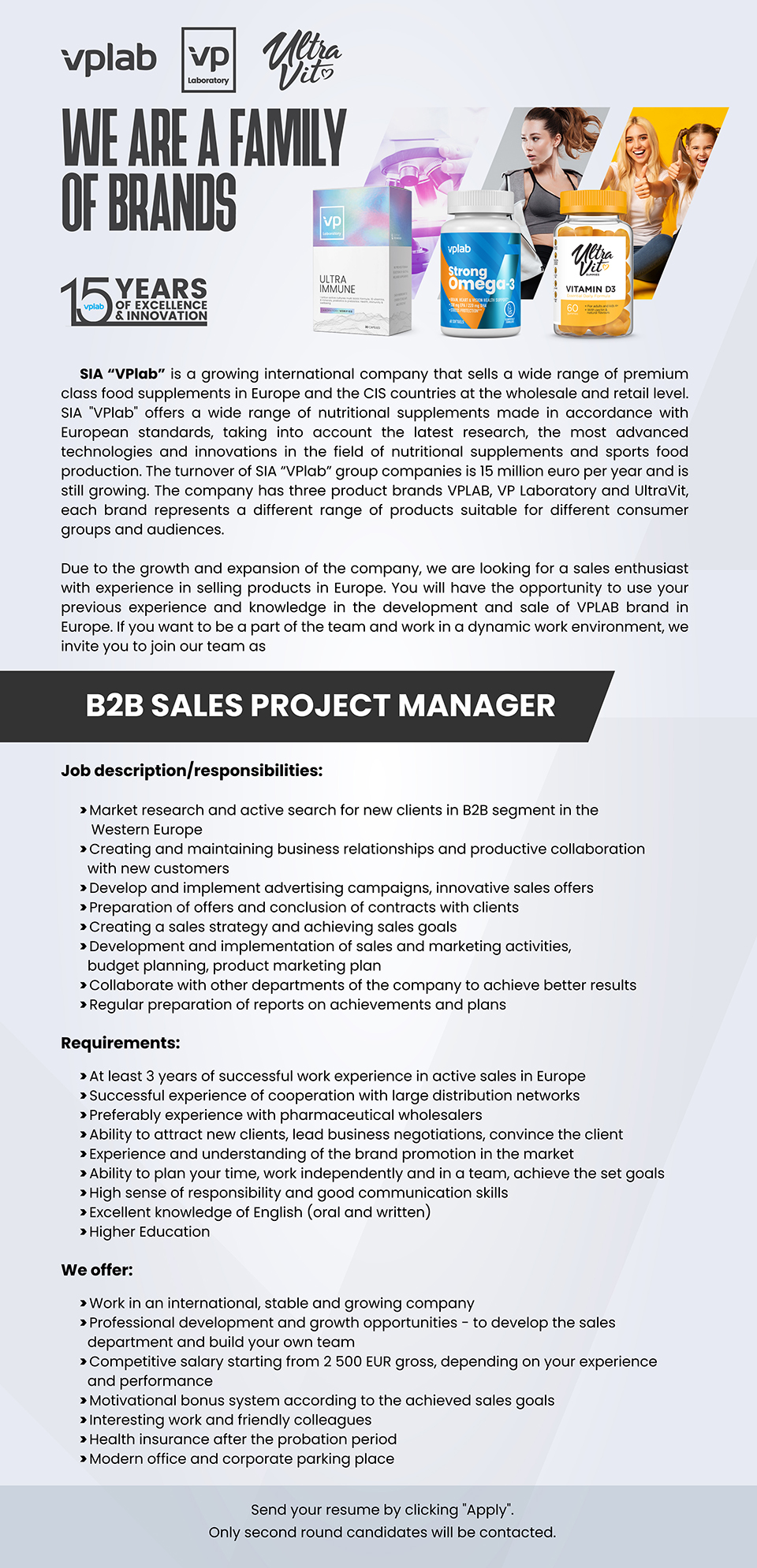 VPlab ir augošs starptautisks uzņēmums, kas vairumtirdzniecības un mazumtirdzniecības līmenī pārdod plašu klāstu premium klases uztura bagātinātājus Eiropas un NVS valstīs. VPlab piedāvā plašu uztura bagātinātāju klāstu, kas izgatavoti saskaņā ar Eiropas un ASV standartiem, ņemot vērā jaunākos pētījumus, progresīvākās tehnoloģijas un inovācijas uztura bagātinātāju un sporta pārtikas ražošanas jomā. Vplab grupas uzņēmumu apgrozījums veido 15 milj. eiro gadā un ar vien pieaug.