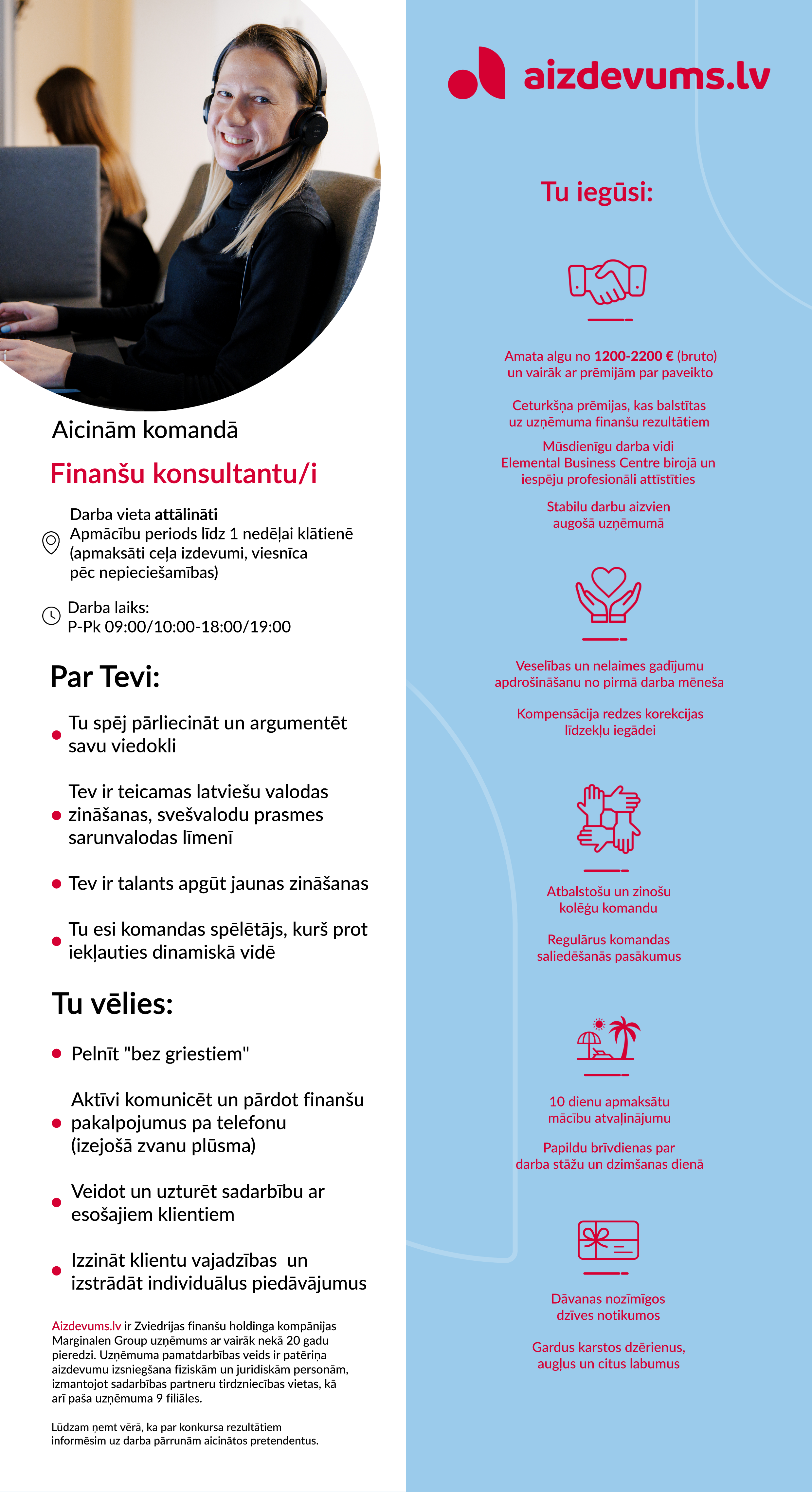 Papildu informācija: Pamatalga no 1000 EUR bruto un prēmijas "bez griestiem". Darba laiks vienojoties 9:00-18:00 vai 10:00-19:00 klātienē & attālināti. Attālinātas darba iespējas pēc apmācību perioda. Ceturkšņa prēmijas - balstītas uz uzņēmuma finanšu rezultātiem.